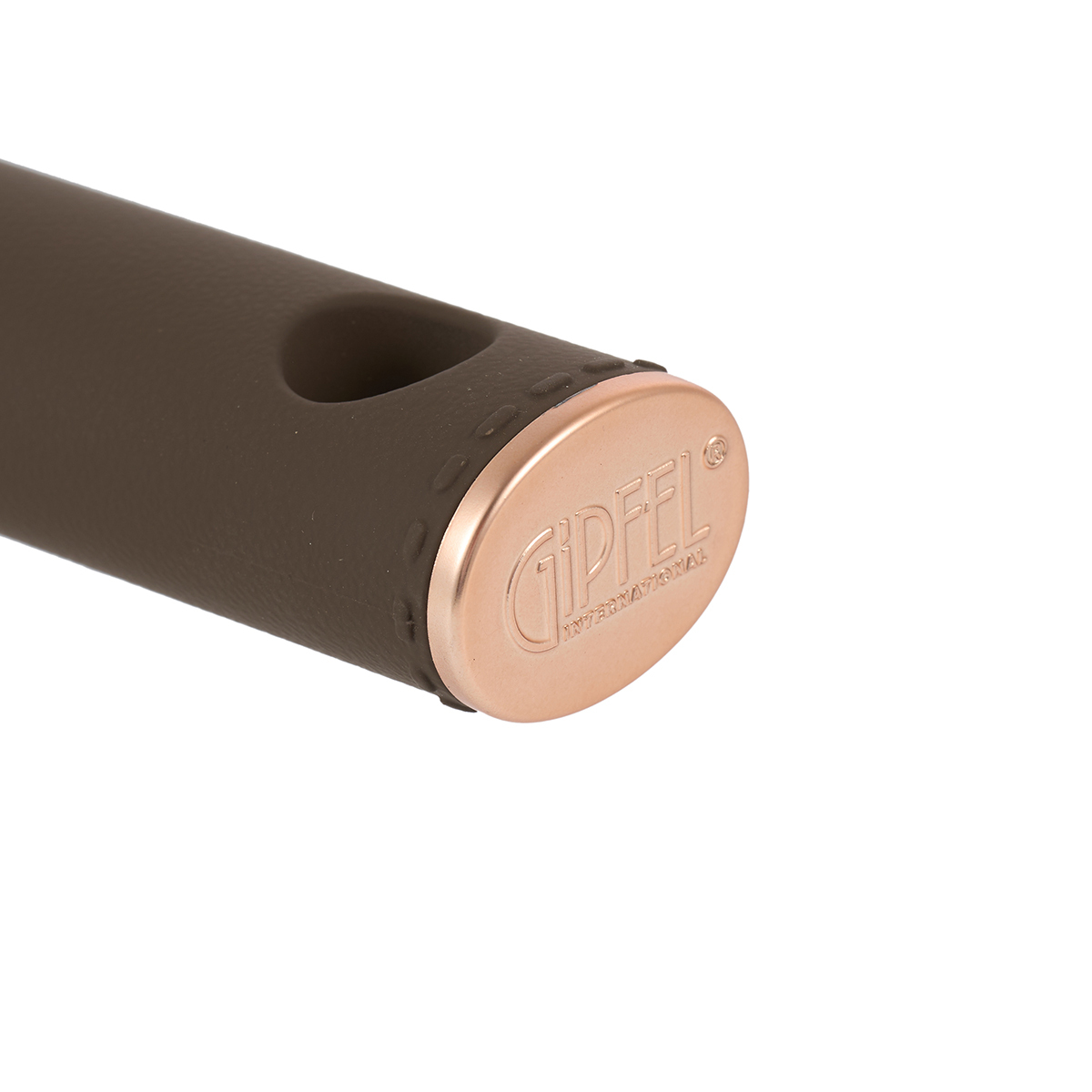 Стильная бакелитовая ручка с покрытием Soft Touch не нагревается и не скользит в руке. Ручка стилизована под кожаное покрытие, по краям отделана вставкой цвета розовое золото с нанесенным логотипом Gipfel, что придает ей статусный вид.