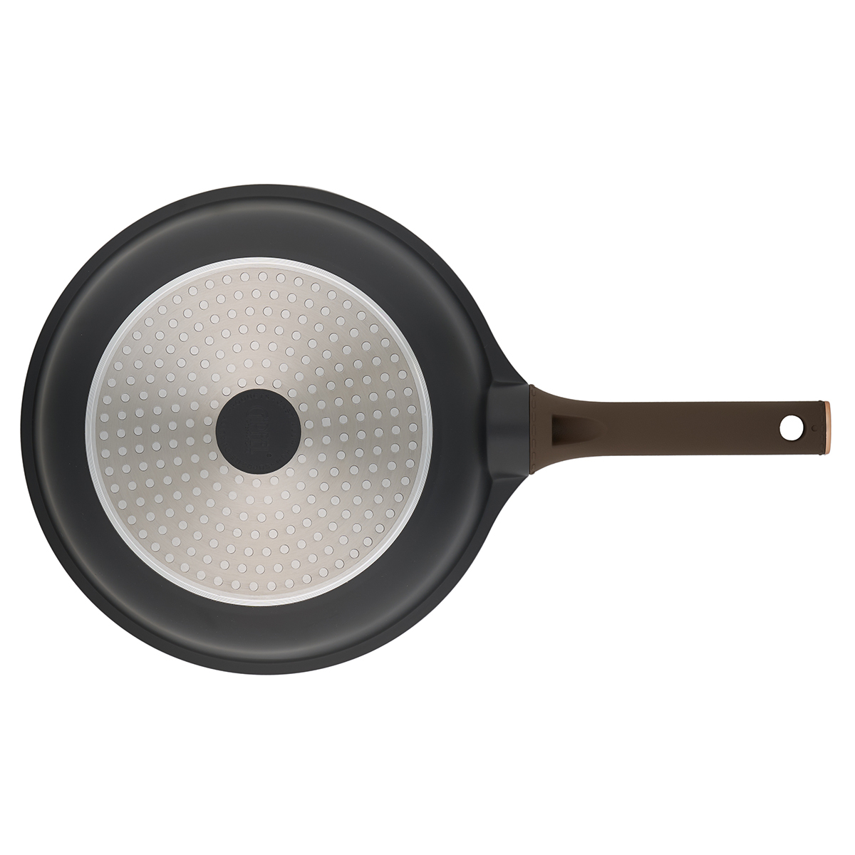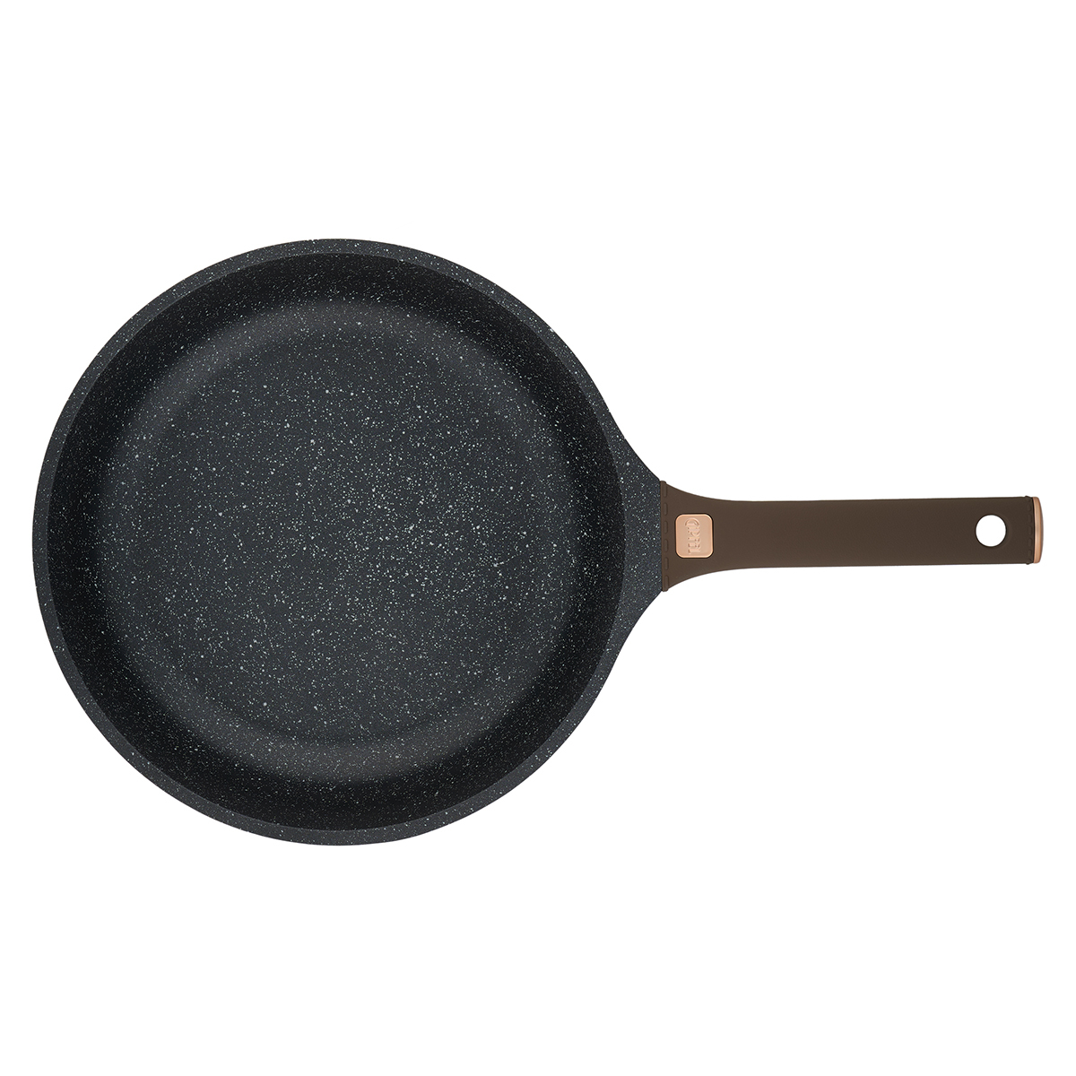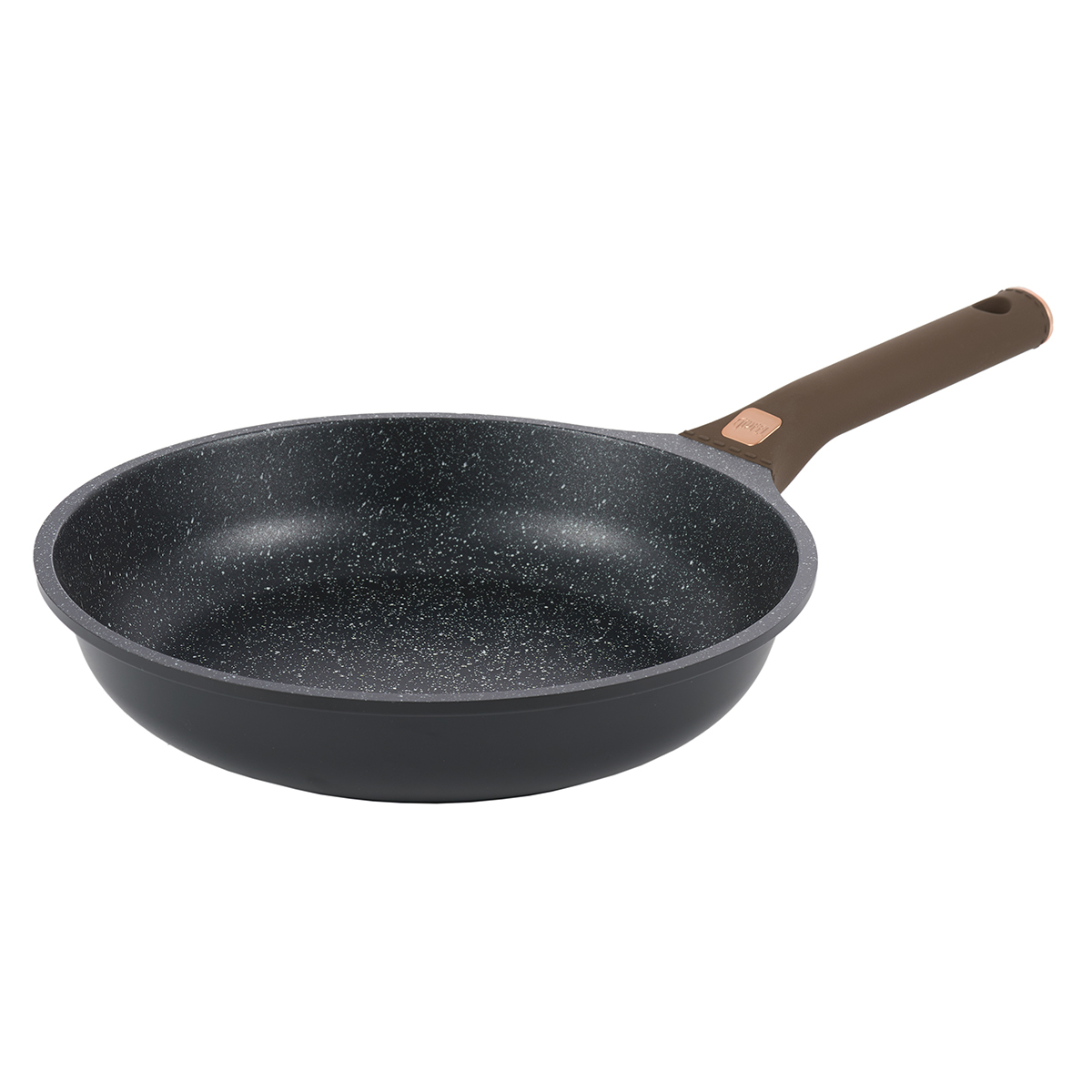 Сковорода выполнена в оригинальном дизайне в черно-коричневом цвете, внутри с белыми вкраплениями.