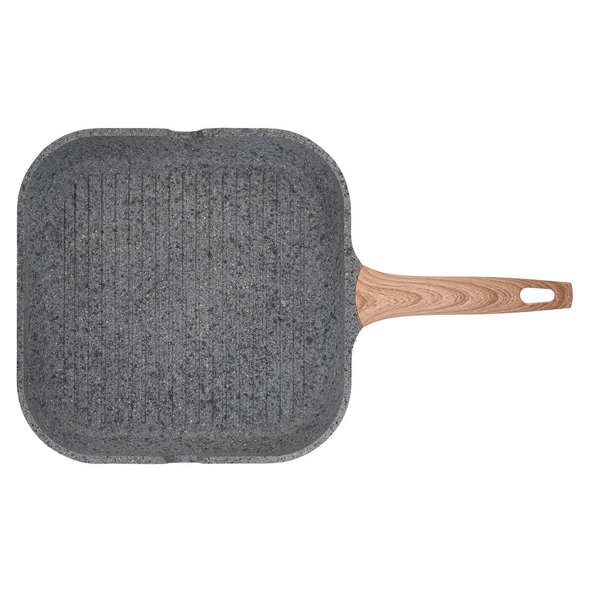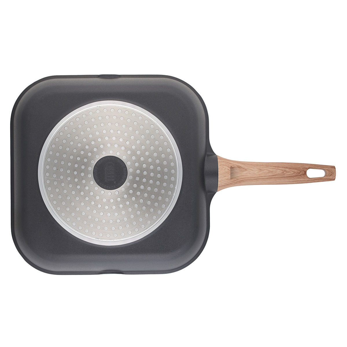 Сковорода квадратной формы (длина стороны – 28 см) и оснащена ребристым дном, которое оставляет аппетитный рисунок в виде полосок, как будто блюдо приготовлено на решетке барбекю.