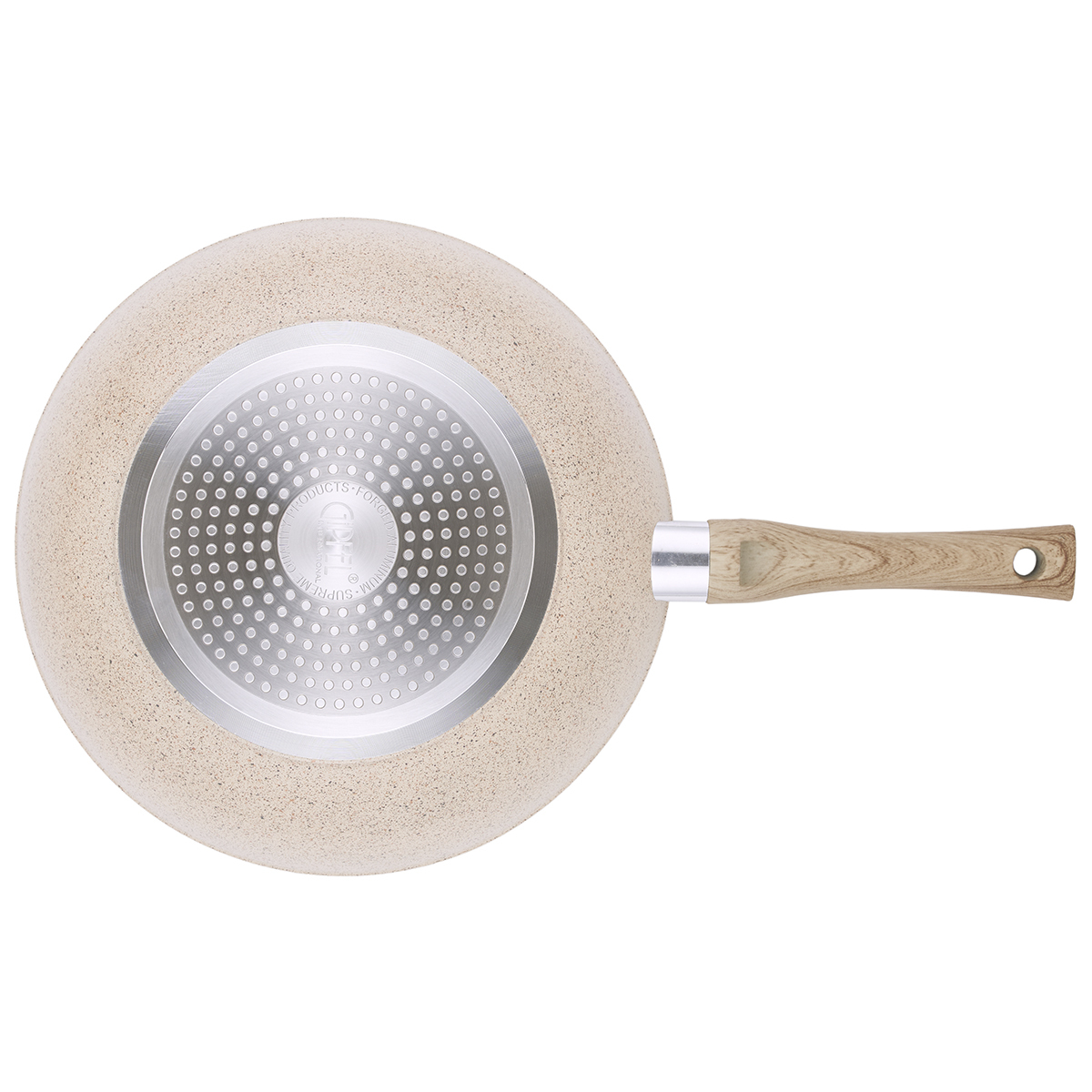 Изготовлена из кованого алюминия, что позволяет ей быстро и равномерно нагреваться.