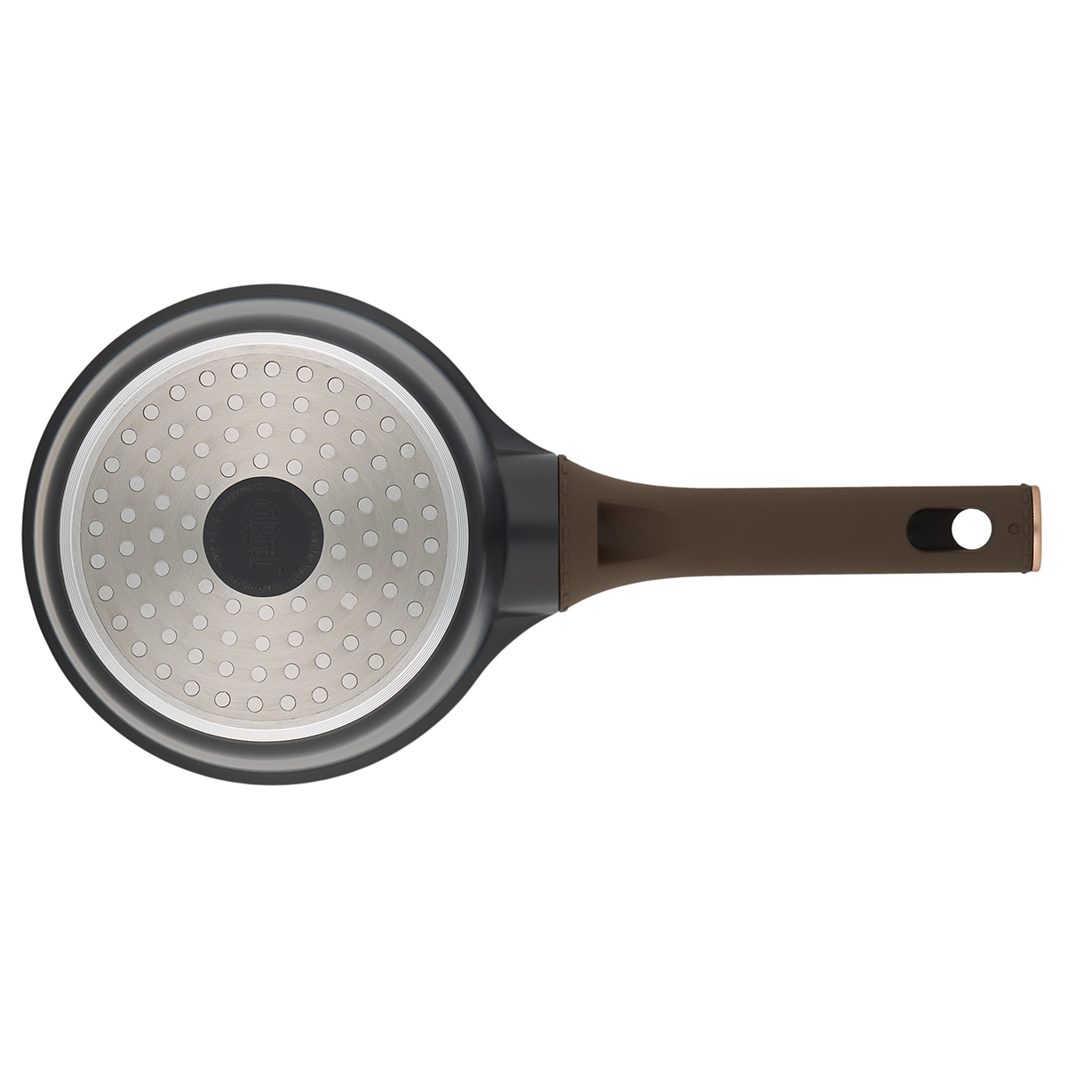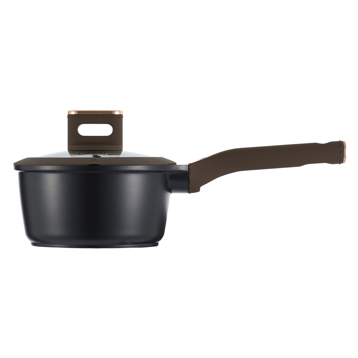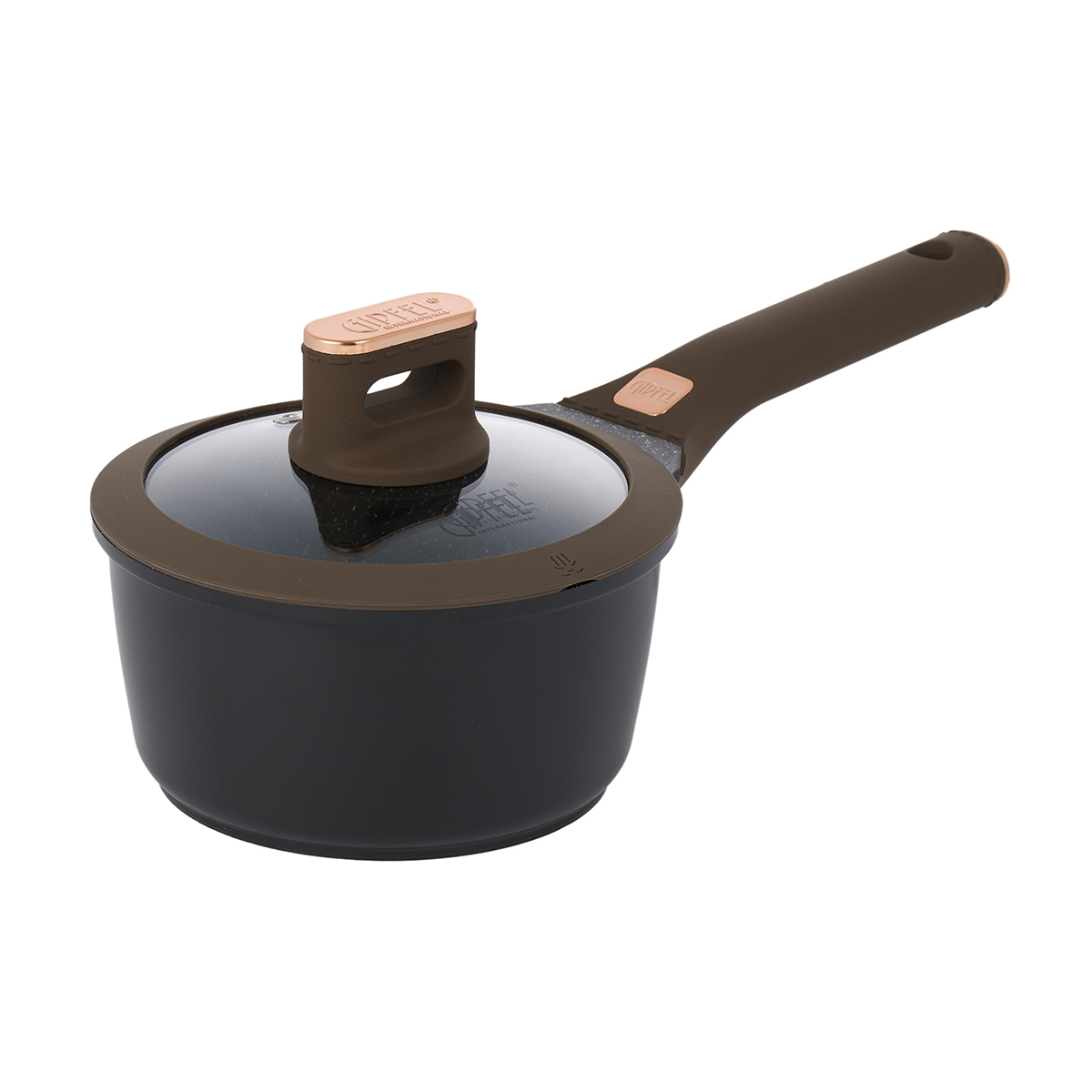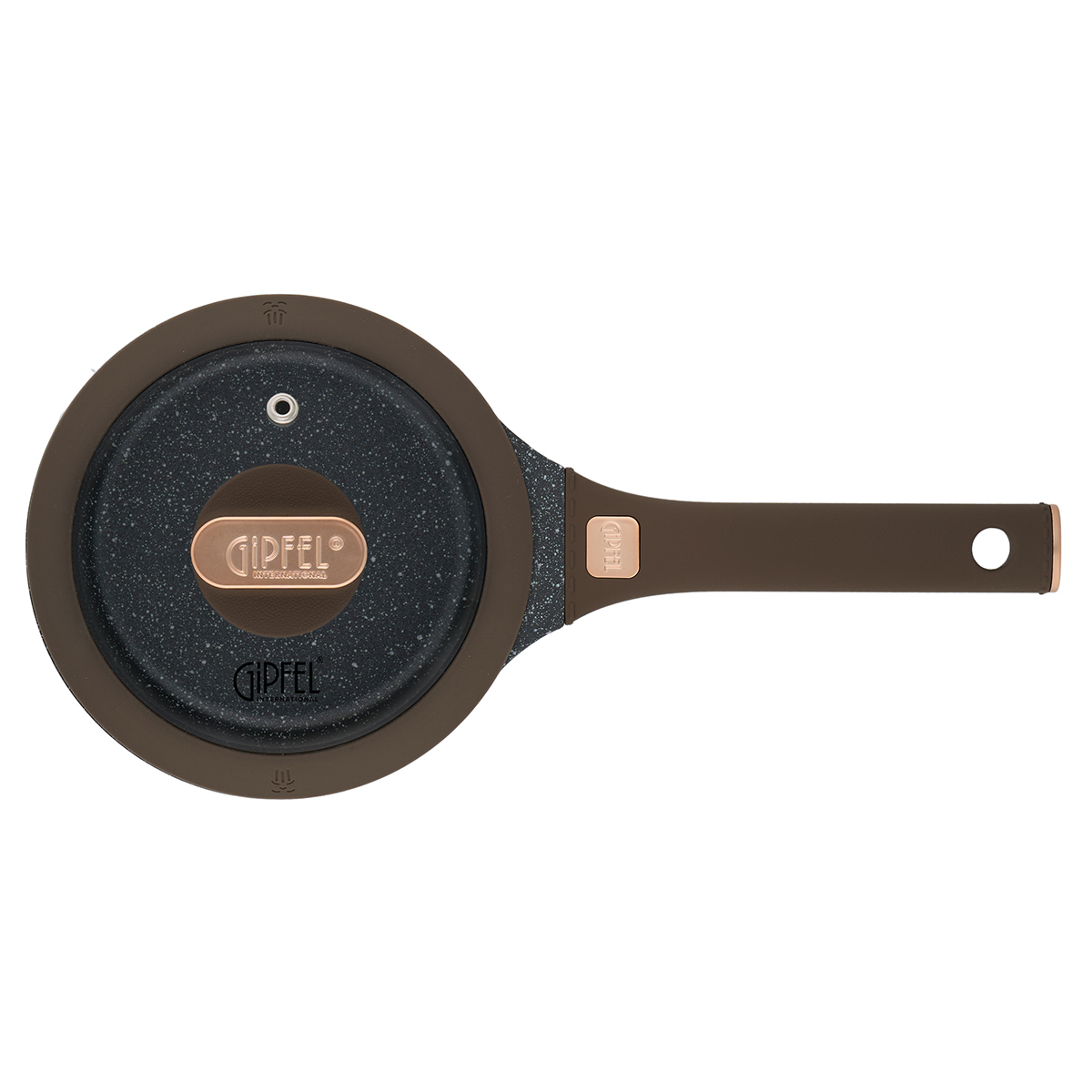 Алюминиевый ковш Gipfel Taurus 52661. Размер 16х8,5 см. Изготовлен из литого алюминия с 4-слойным антипригарным мраморным покрытием Whitford QuanTanium, c бакелитовой ручкой с покрытием Soft-touch. Цвет: черный, коричневый.