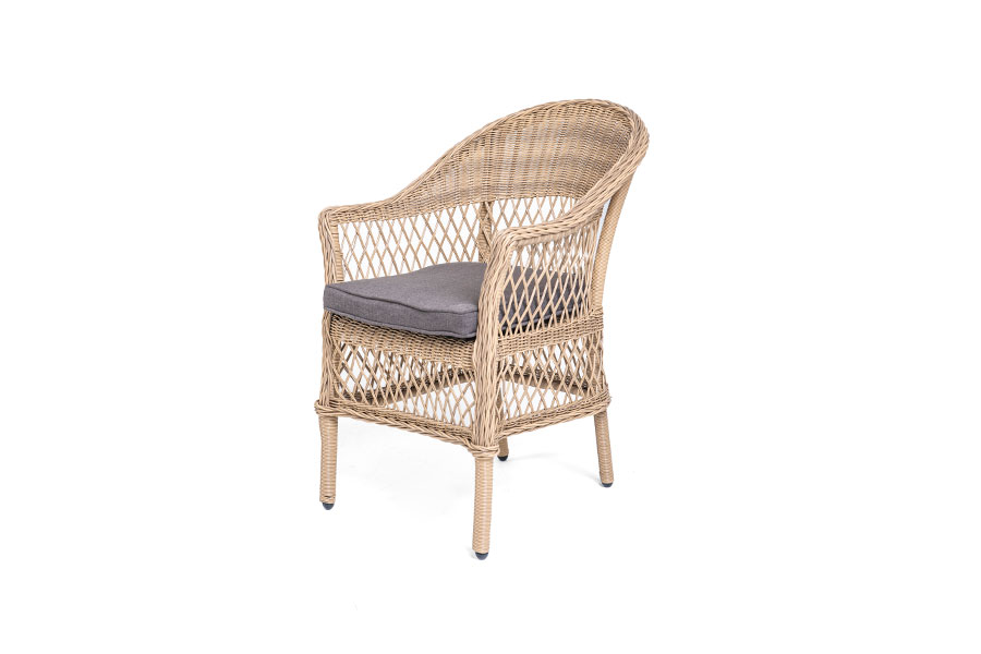 Алюминий используется при создании прочного каркаса мебели. Оформлен ручным плетением из круглого искусственного ротанга соломенного цвета.