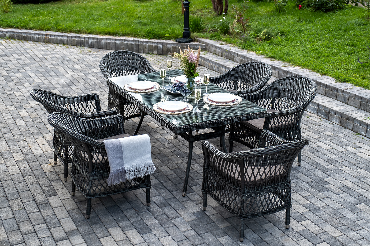 Обеденная группа «Амароне» относится к числу садовой мебели для обустройства открытых террас и веранд.