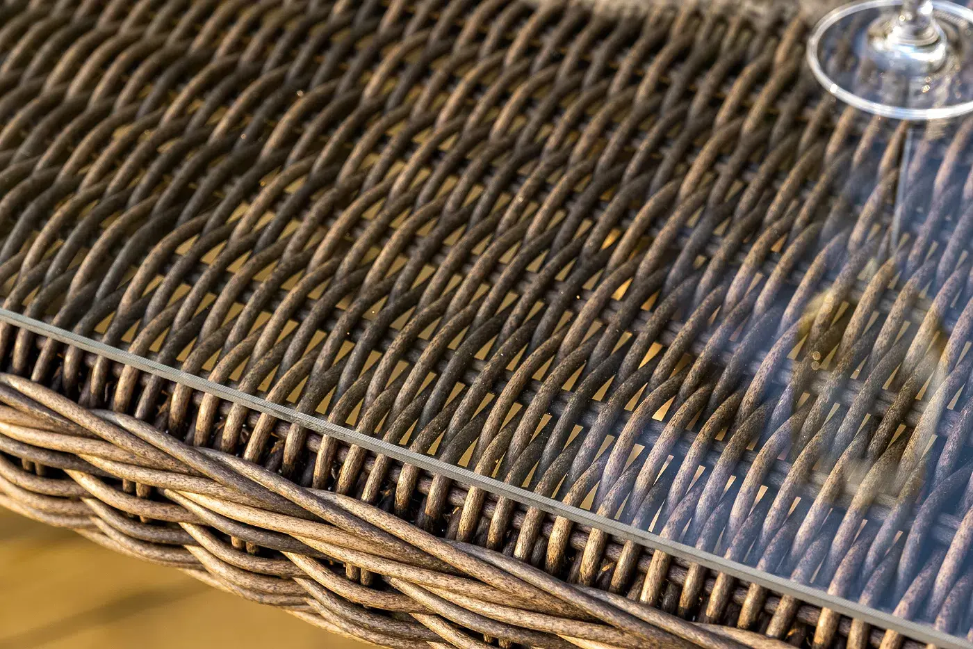 В качестве рабочей поверхности плетеного обеденного стола выступает стеклянная столешница, которая крепится при помощи вакуумных силиконовых держателей и поставляется в собранном виде.