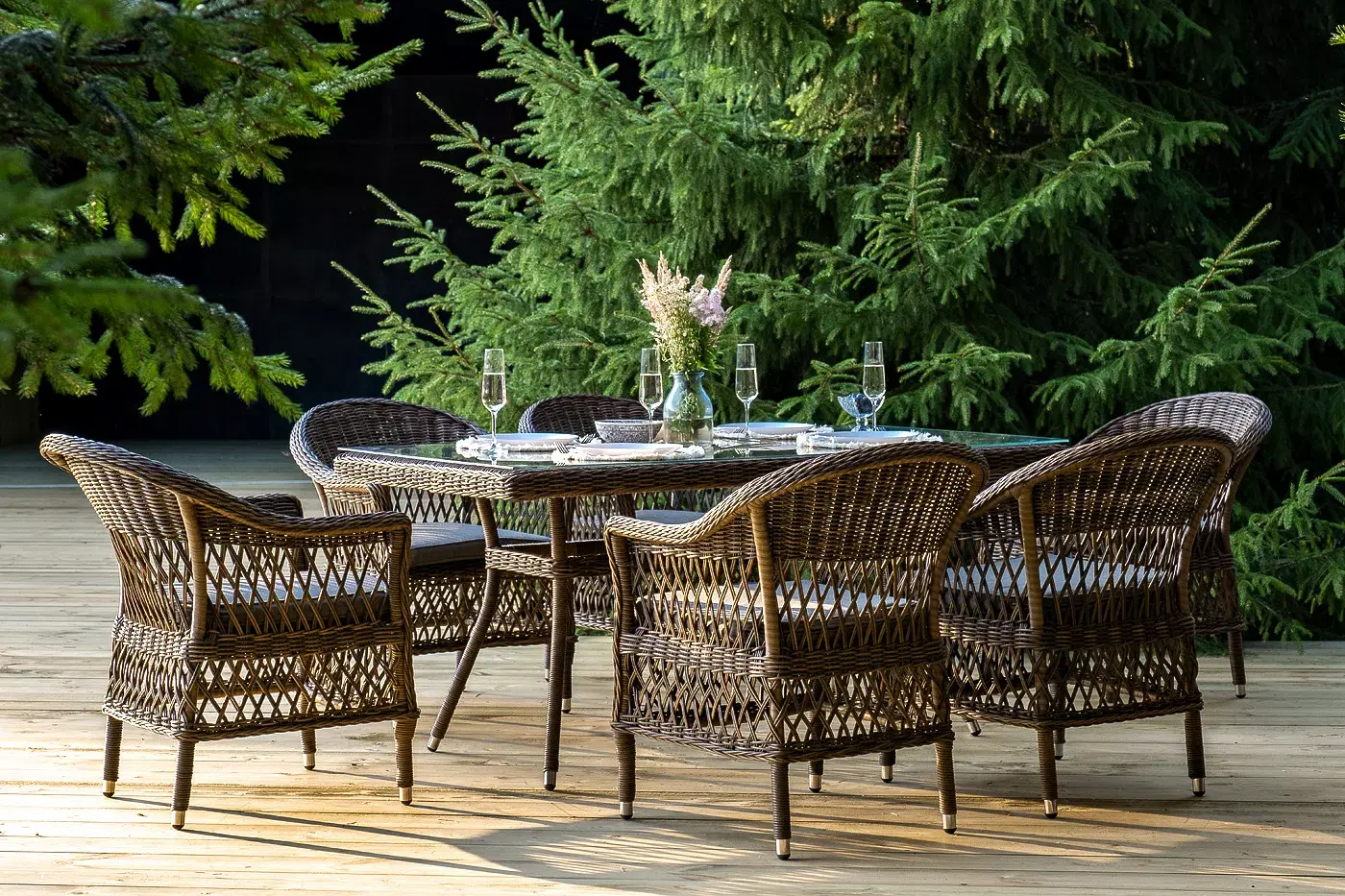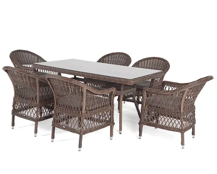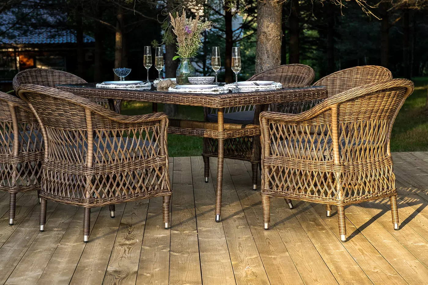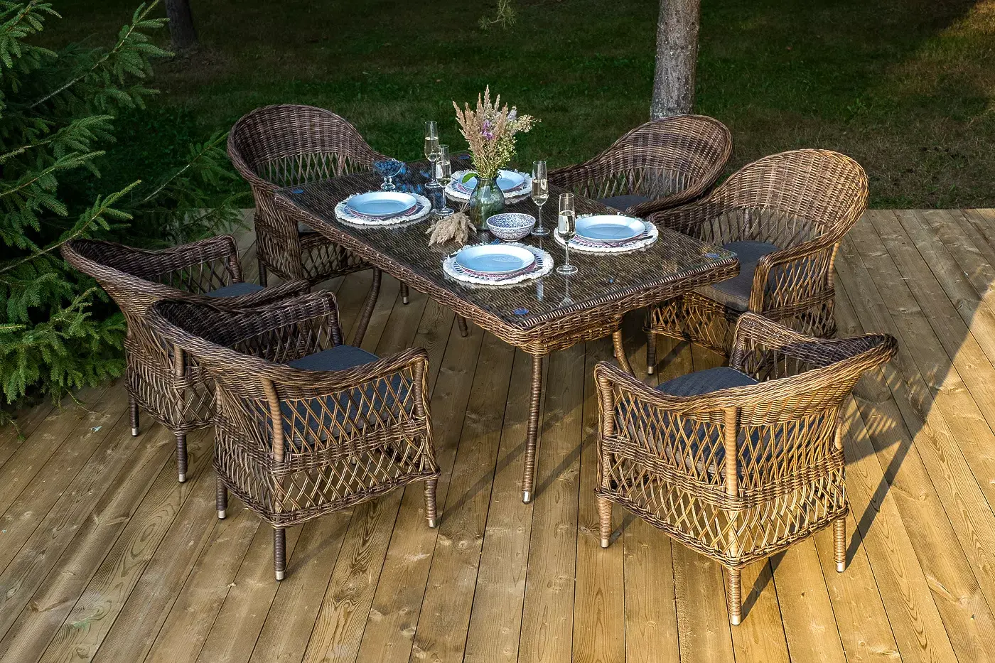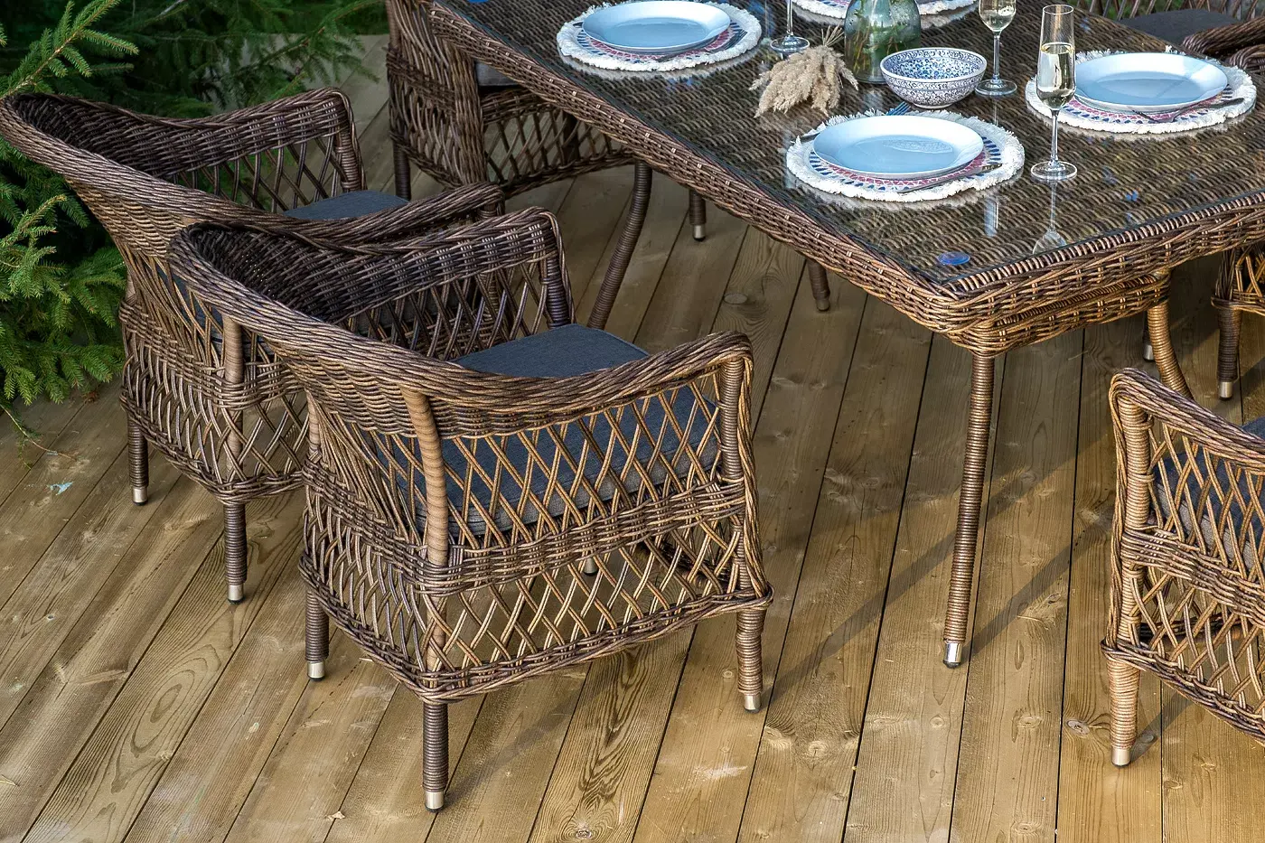 Обеденная группа «Амароне» относится к числу садовой мебели для обустройства открытых террас и веранд.