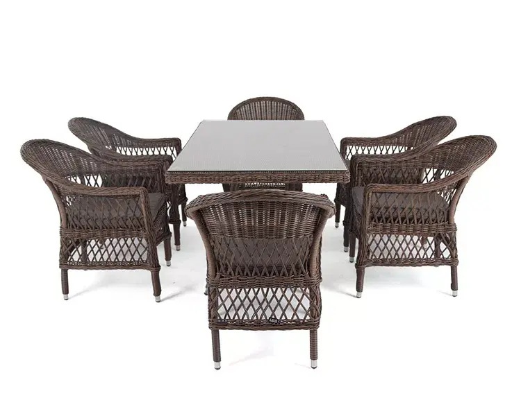 Алюминий используется при создании прочного каркаса мебели. Оформлен ручным плетением из круглого искусственного ротанга коричневого цвета.