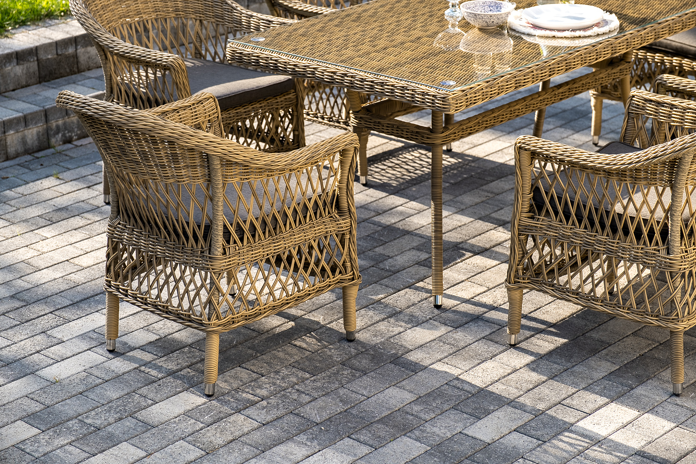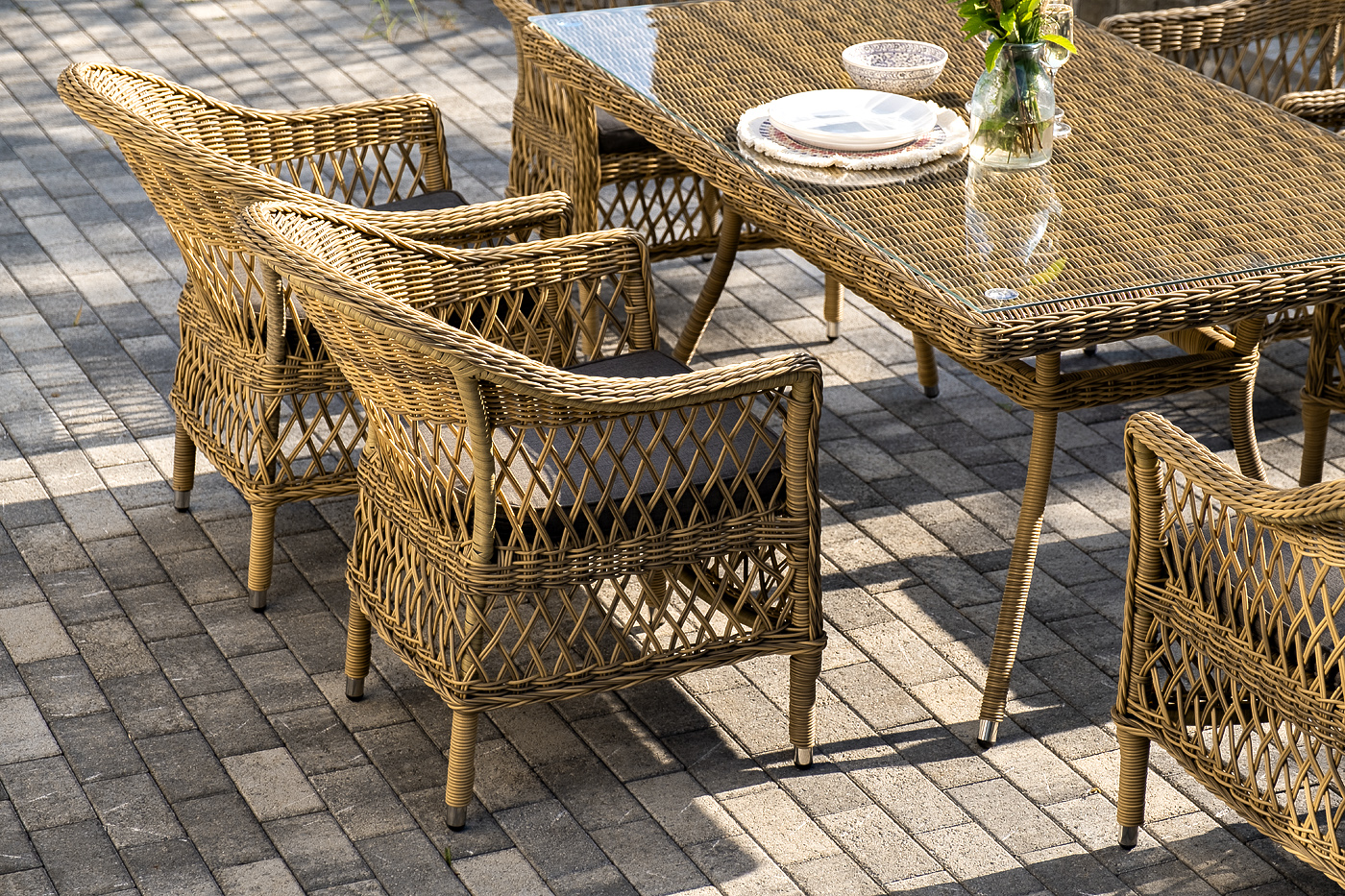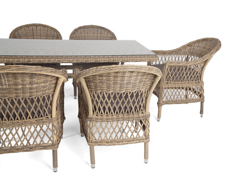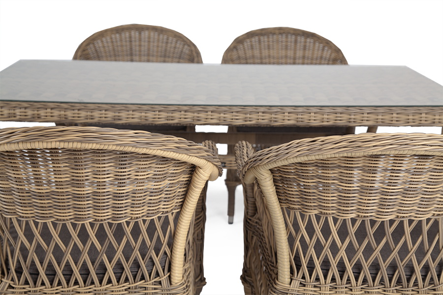 В качестве рабочей поверхности плетеного обеденного стола выступает стеклянная столешница, которая крепится при помощи вакуумных силиконовых держателей и поставляется в собранном виде.