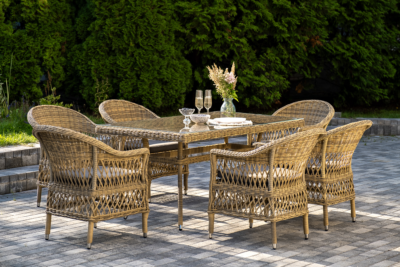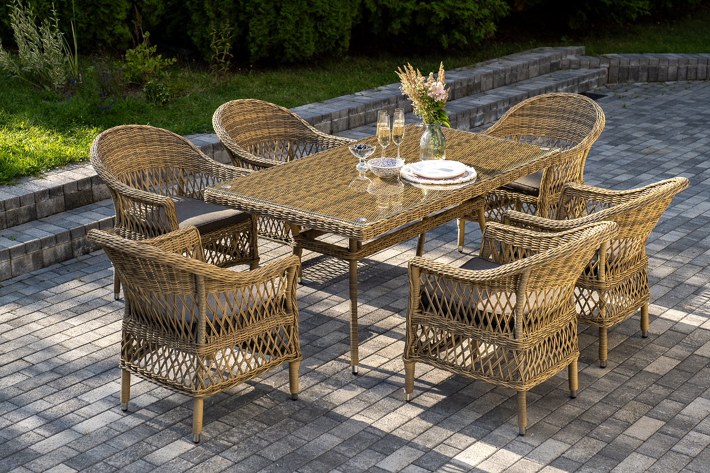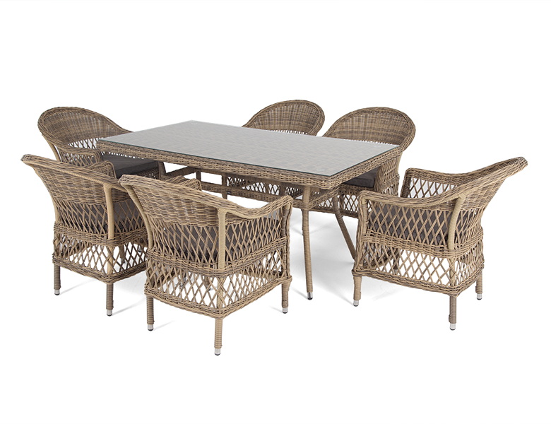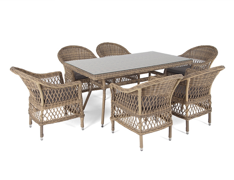 Обеденная группа «Амароне» относится к числу садовой мебели для обустройства открытых террас и веранд.