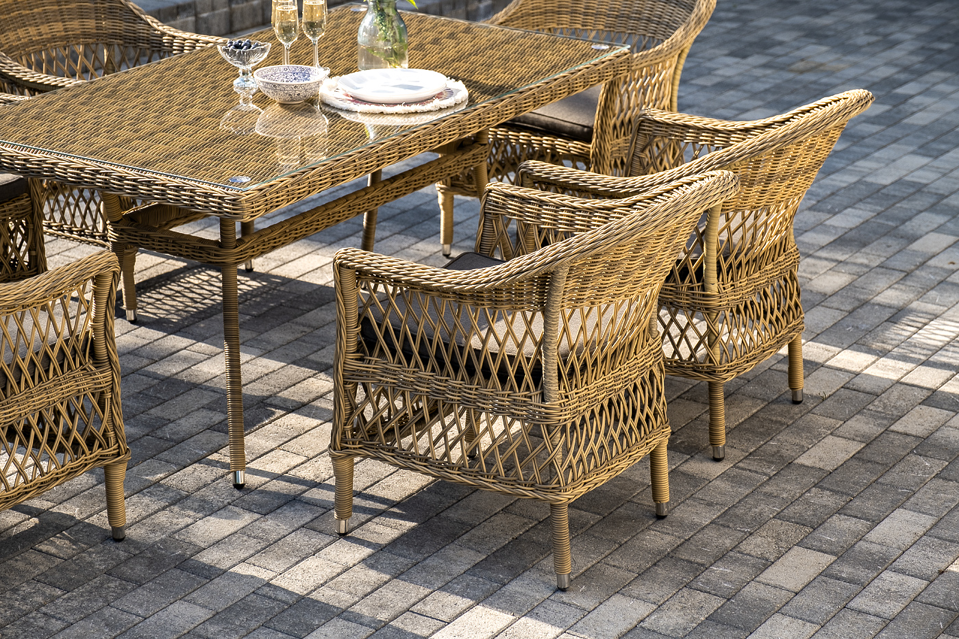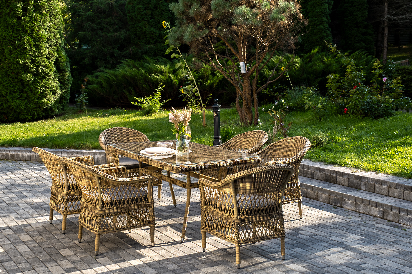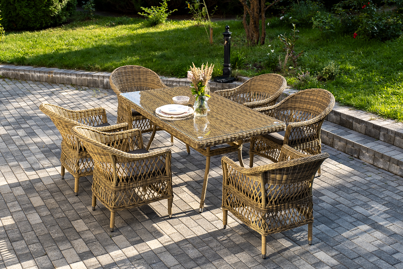 Обеденная группа «Амароне» относится к числу садовой мебели для обустройства открытых террас и веранд.