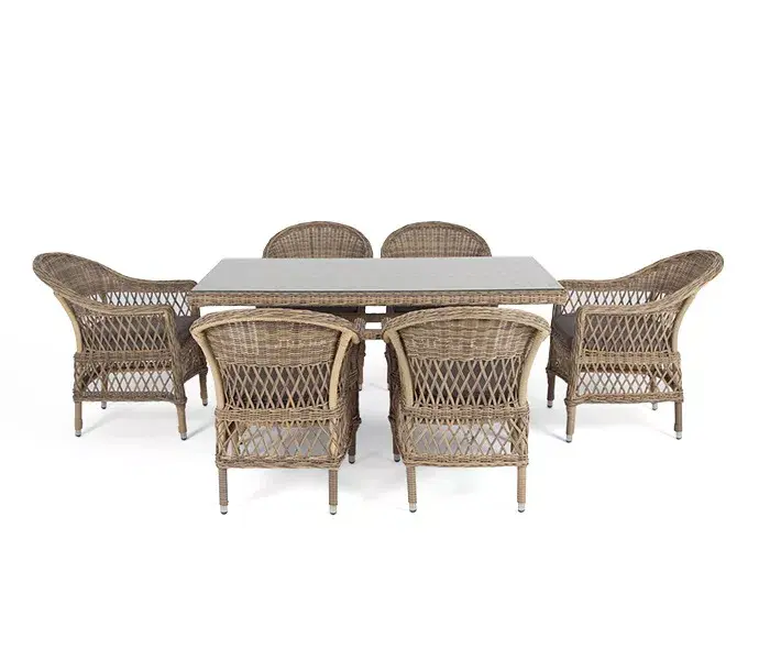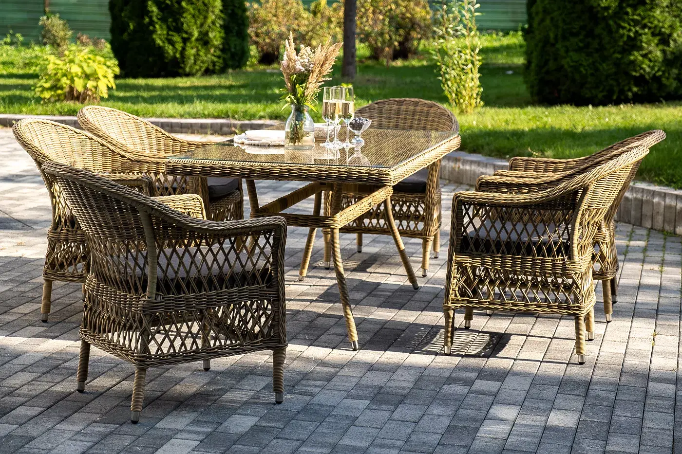 Обеденная группа «Амароне» относится к числу садовой мебели для обустройства открытых террас и веранд.