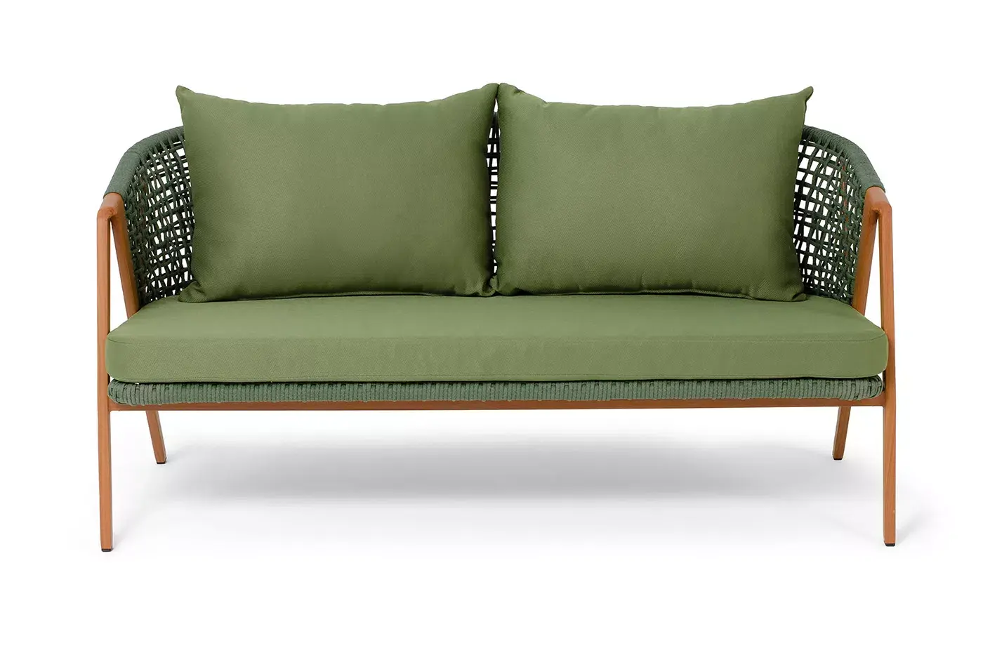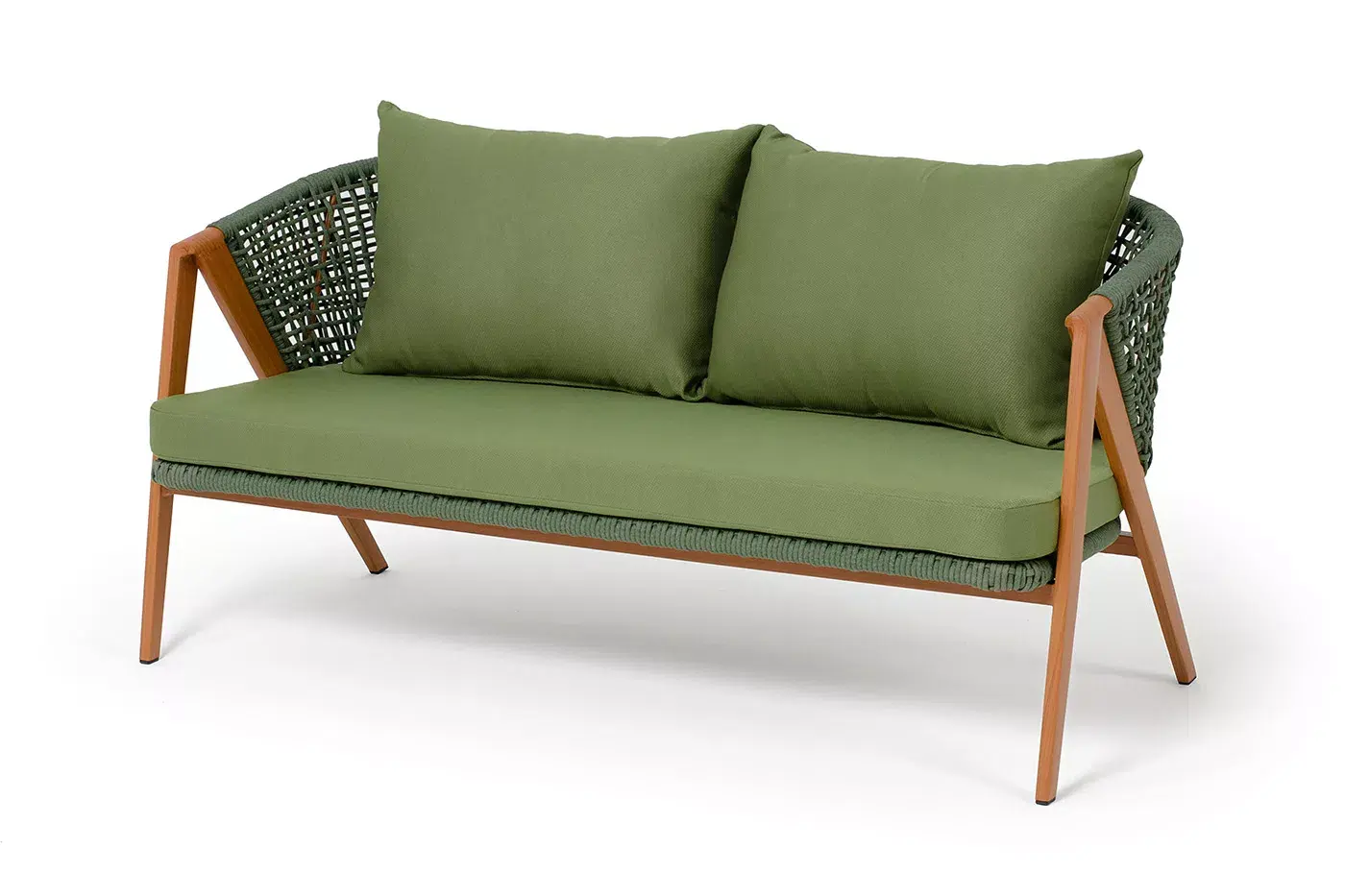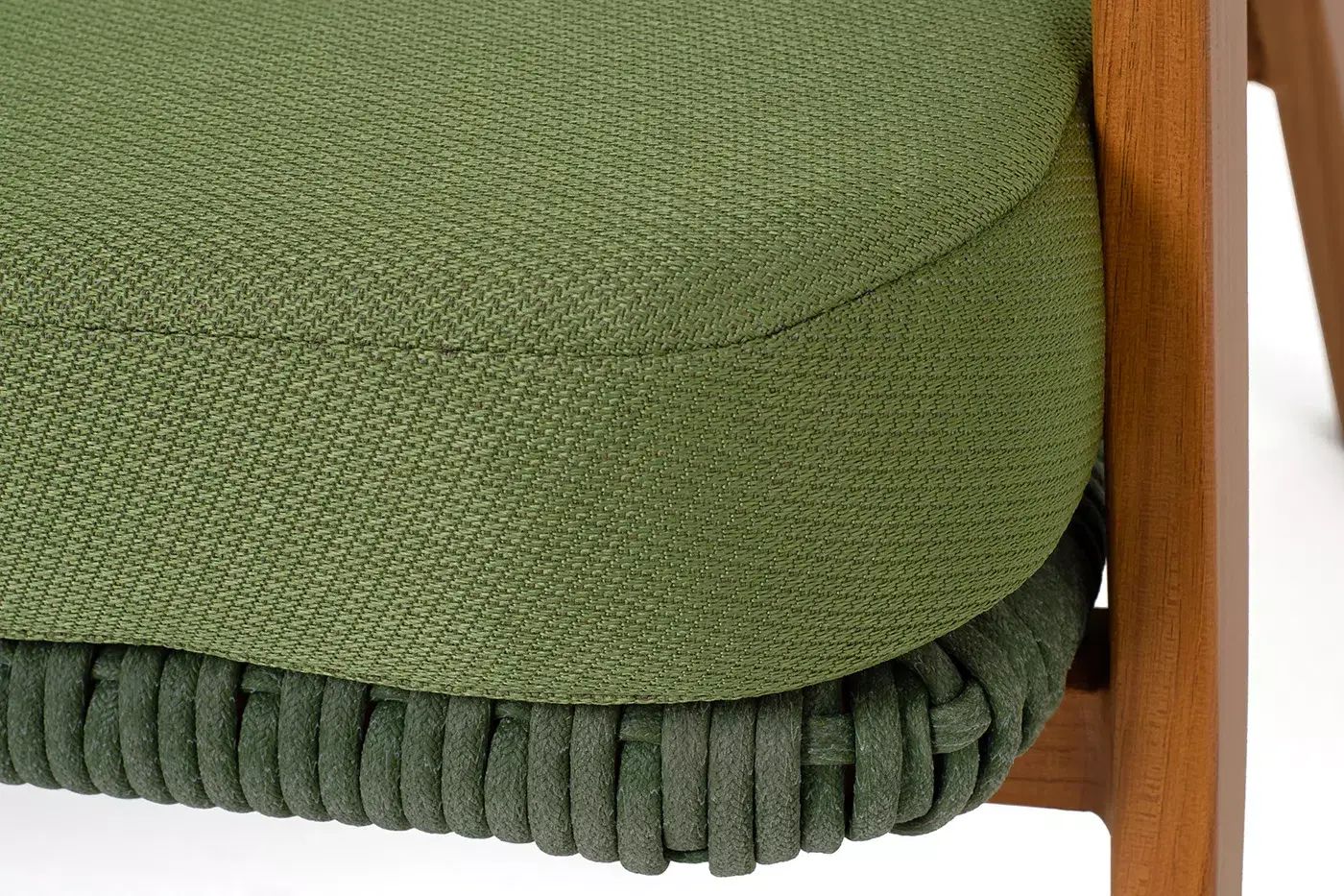 Изготовлен из алюминиевого каркаса, оплетенного вручную эластичными синтетическими лентами из высокопрочных полиэфирных волокон. Роуп является гипоаллергенным, прочным, износостойким и устойчивым к ультрафиолету. Приятный на ощупь и напоминает шерстяное плетение. Цвет каркаса – «под дерево», оплетки - зеленый. На ножках стула идут черные пластиковые наконечники (заглушки).