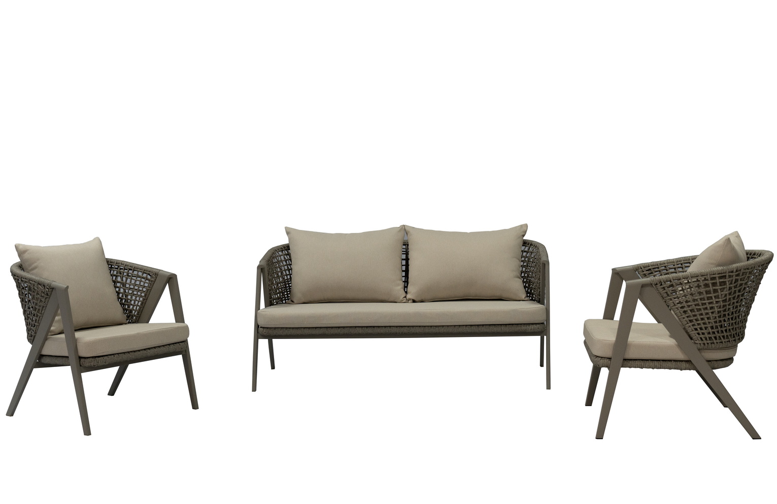 Диван и кресла имеют алюминиевый каркас, оплётный вручную искусственным ротангом серого цвета. На ножках установлены чёрные пластиковые наконечники‑заглушки.