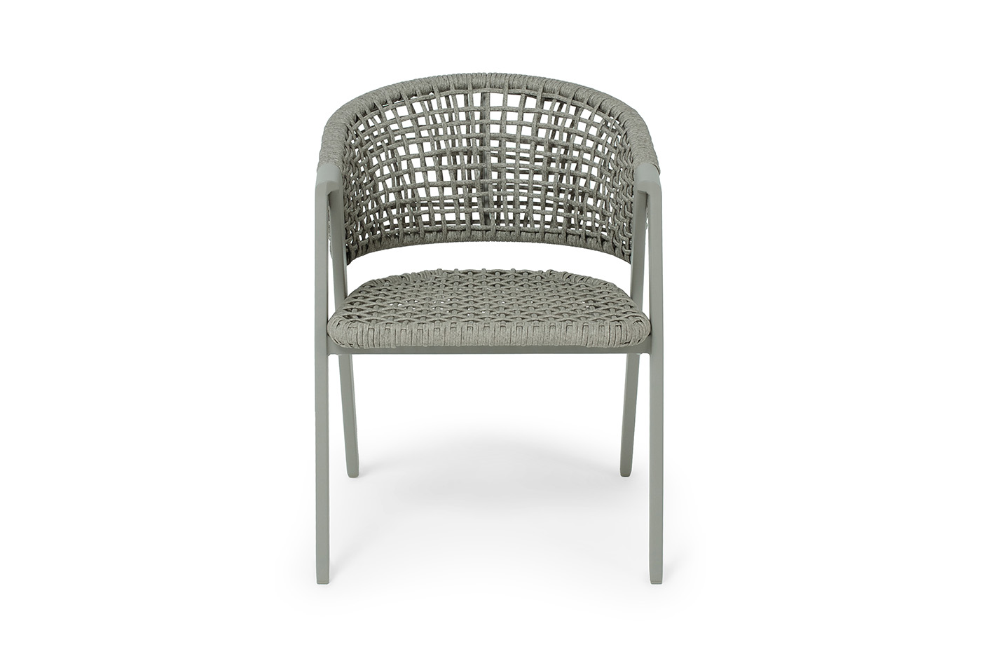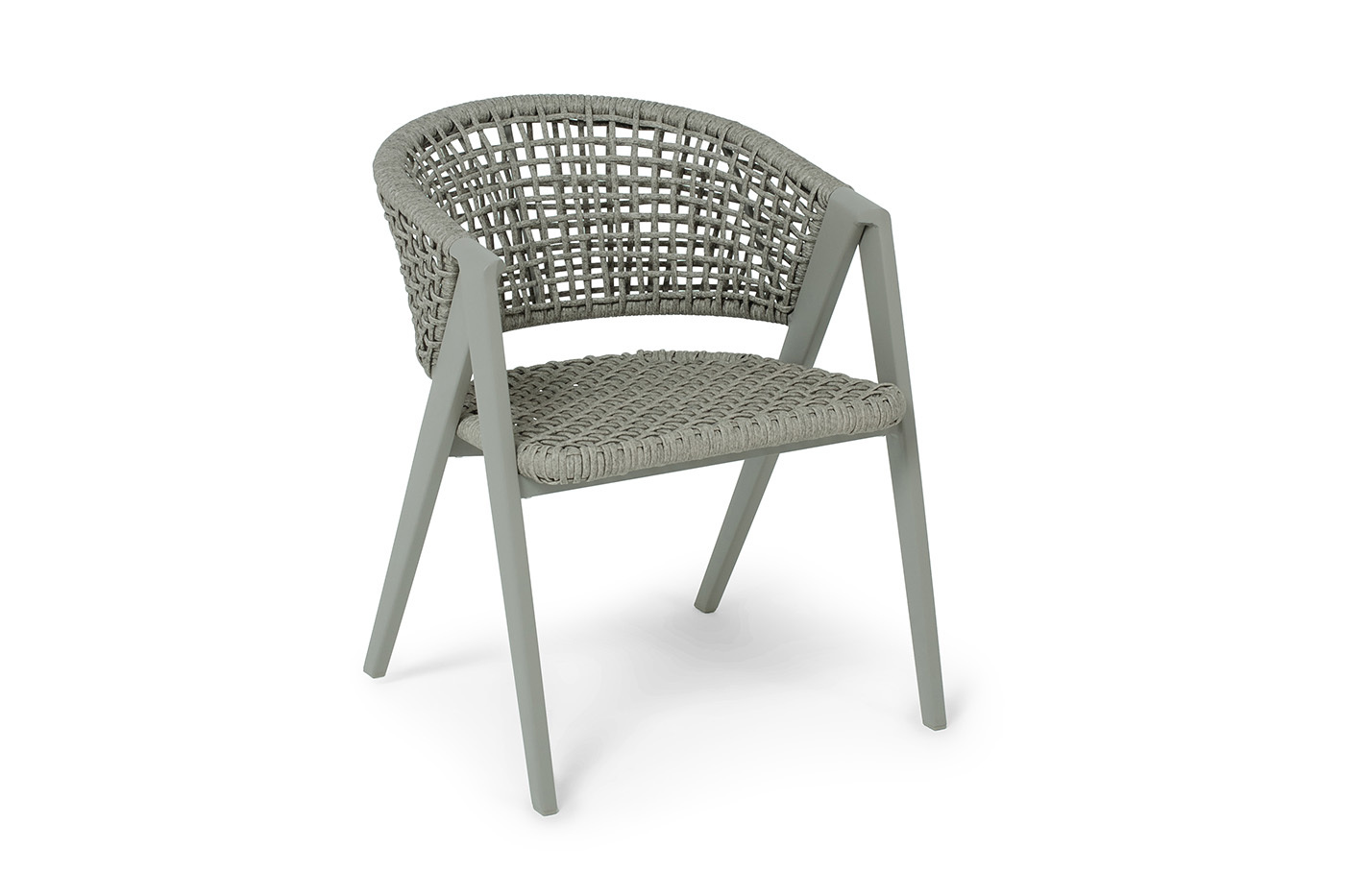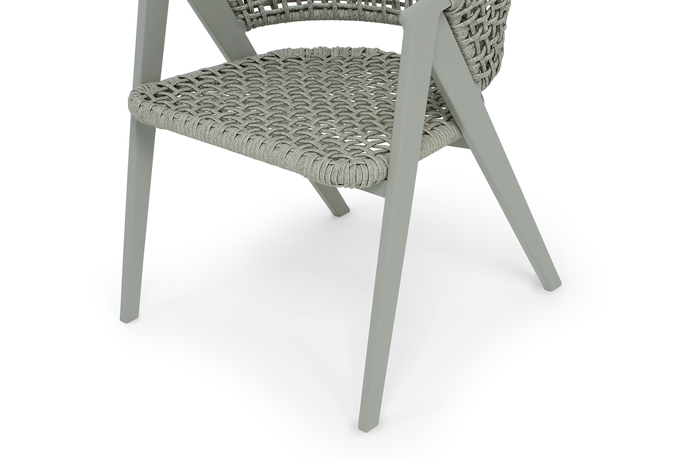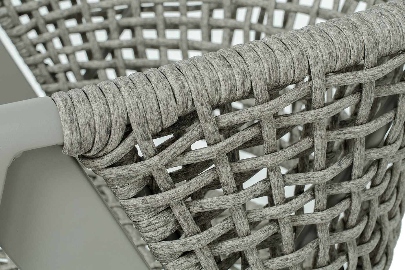 Стул выполнен из алюминиевого каркаса, который вручную оплетен круглым искусственным ротангом. Приятный на ощупь и напоминает шерстяное плетение. Цвет каркаса и оплетки – серый. На ножках стула идут серые пластиковые наконечники (заглушки).