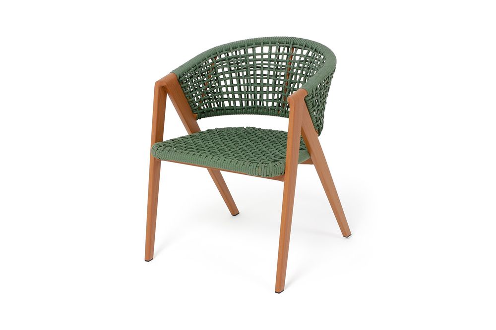 Стул выполнен из алюминиевого каркаса, который вручную оплетен круглым искусственным ротангом. Приятный на ощупь и напоминает шерстяное плетение. Цвет каркаса – «под дерево», оплетки - зеленый. На ножках стула идут черные пластиковые наконечники (заглушки).