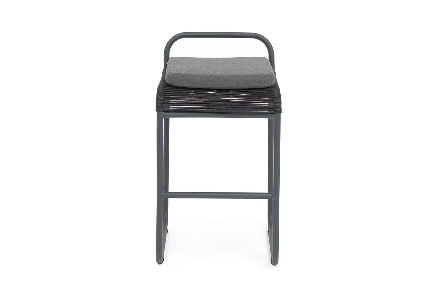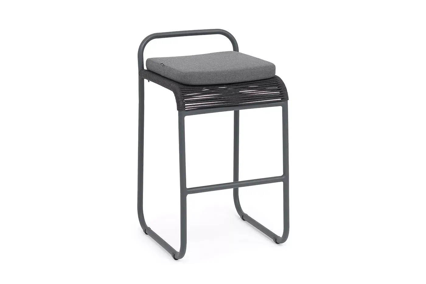 Барный стул «Ането» представлен в алюминиевом каркасе темно-серого (RAL7024) цвета. Оплетен вручную эластичными синтетическими лентами из высокопрочных полиэфирных волокон темно-серого цвета.