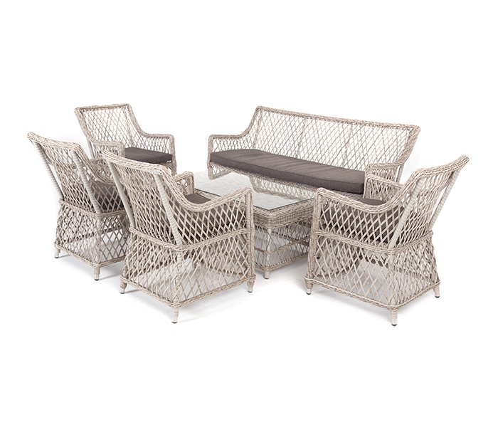 Лаунж-зона «Асти» подходит для размещения 6 персон. За прочность конструкции отвечает каркас из алюминия.