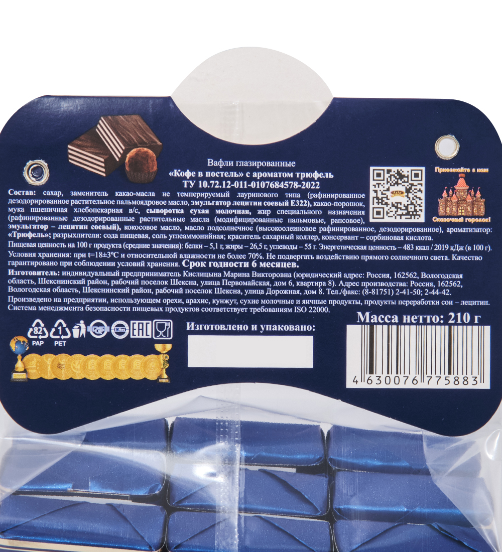 Материал: Сахар, заменитель какао-масла нетемперируемый лауринового типа (рафинированное дезодорированное растительное пальмоядровое масло, эмульгатор лецитин соевый (Е322)), какао-порошок, мука пшеничная хлебопекарная в/с, сыворотка сухая молочная, жир специального назначения (модифицированные растительные масла (пальмовое, рапсовое), эмульгатор лецитин соевый), кокосовое масло, масло подсолнечное (высокоолеиновое рафинированное, дезодорированное), ароматизатор «Трюфель шоколадный», сахарный колер, консервант – сорбиновая кислота.