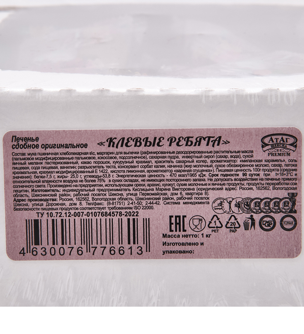 Материал: Мука пшеничная хлебопекарная в/с, маргарин (рафинированные дезодорированные растительные масла в натуральном и модифицированном виде, вода, соль, эмульгаторы: моно- и диглицериды жирных кислот (E 471), лецитин соевый (E 322), ароматизатор «масло», регулятор кислотности лимонная кислота, краситель бета-каротин, антиокислитель аскорбиновая кислота), овсяные хлопья, сахар, вода питьевая, сироп глюкозы, разрыхлители: натриевые соли угольной кислоты (E 500), гидрокарбонат аммония (E 503), гидрокарбонат натрия (E 500), соль, ароматизатор «ваниль», глазурь (сахар, какао-масло, сухое цельное молоко, эмульгатор лецитин соевый (E 322), ароматизатор «ваниль»), консервант сорбат калия (E 202).
