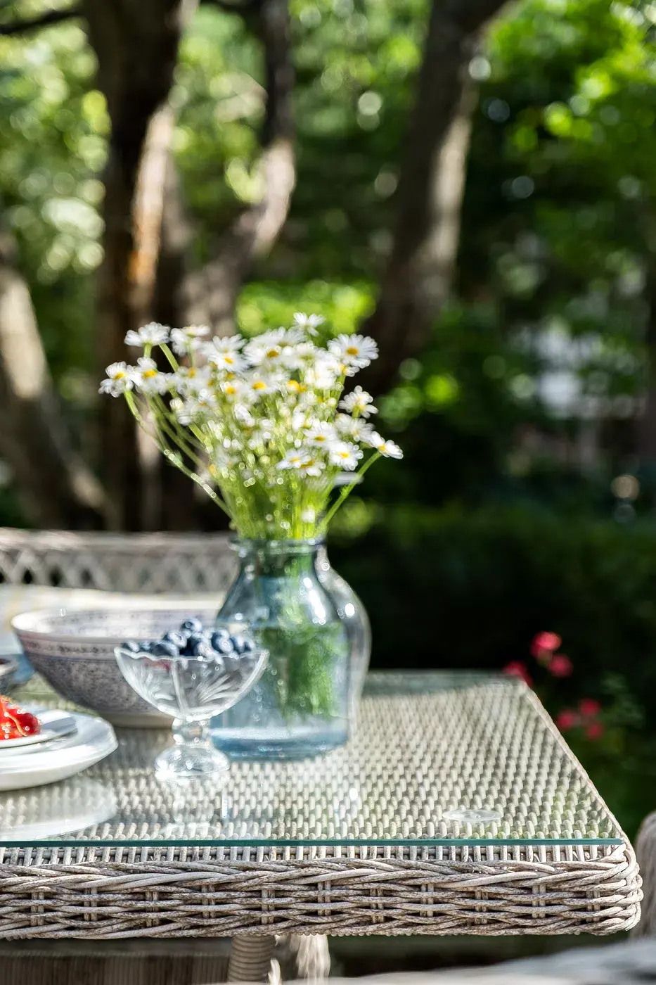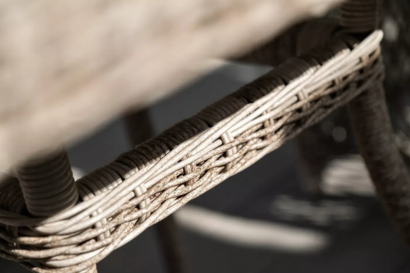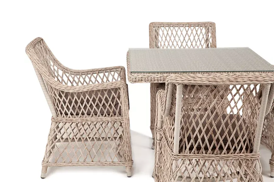 Каркас мебели выполнен из прочного и легкого алюминия, оплетенного вручную искусственным ротангом бежевого цвета, столешница – закаленное стекло.