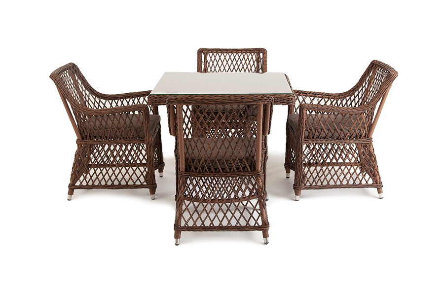 Каркас всех изделий изготовлен из легкого алюминия, оплетенного вручную долговечным искусственным ротангом. На креслах предусмотрены подушки со съёмными чехлами. Комплект выполнен в насыщенном коричневом цвете, имитирующем натуральную ротанговую лозу.