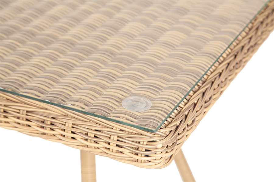Каркас изготовлен из прочного алюминия, вручную оплетенного круглым искусственным ротангом натурального соломенного оттенка. В качестве столешницы использовано ударопрочное стекло, толщиной 5 мм. На стол можно ставить горячие тарелки и чашки, не опасаясь деформации покрытия.
