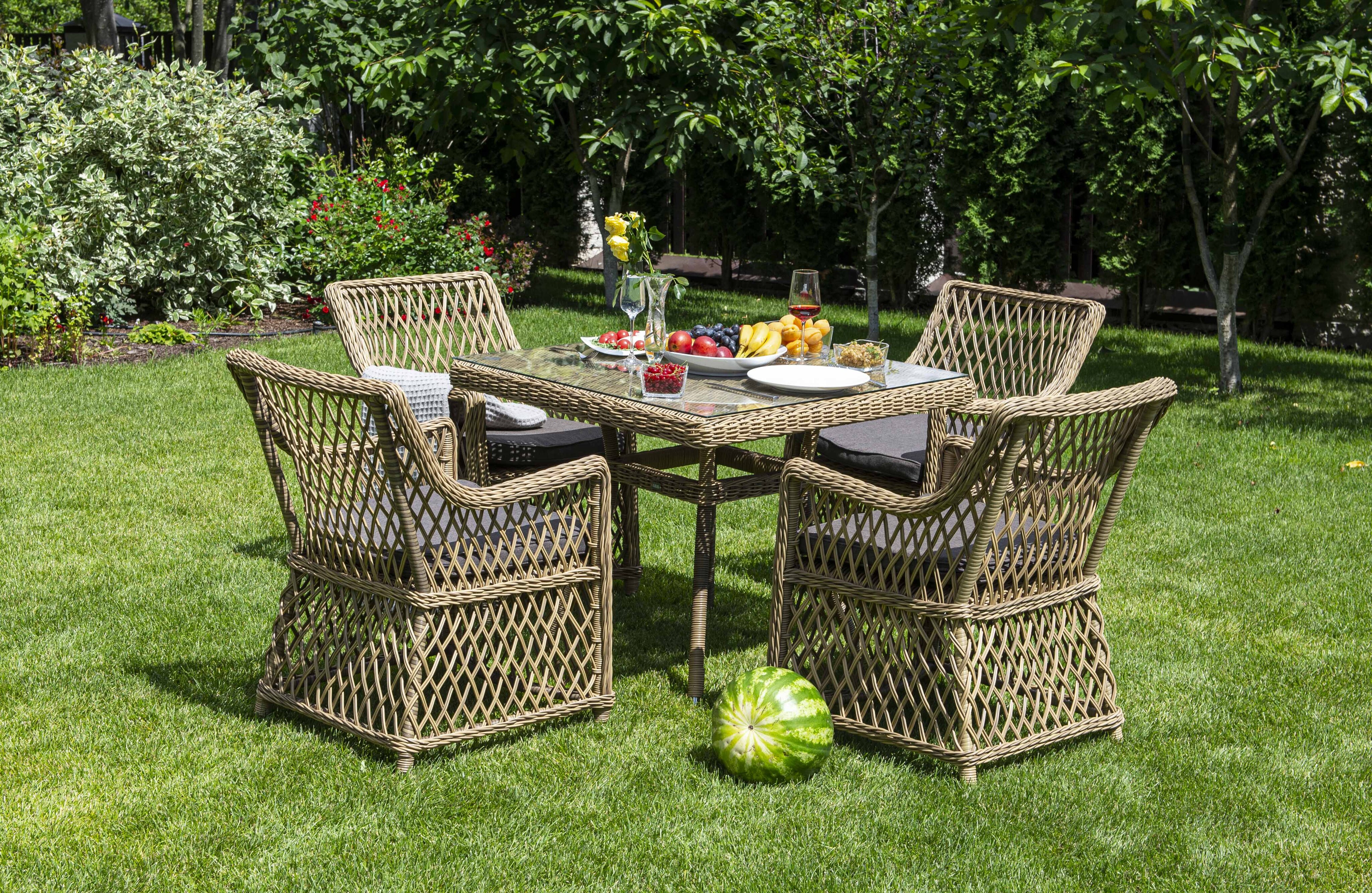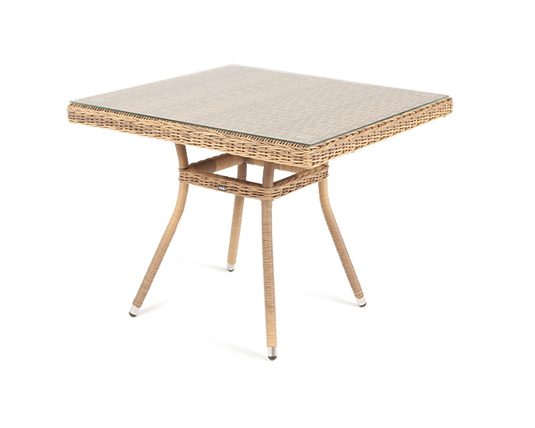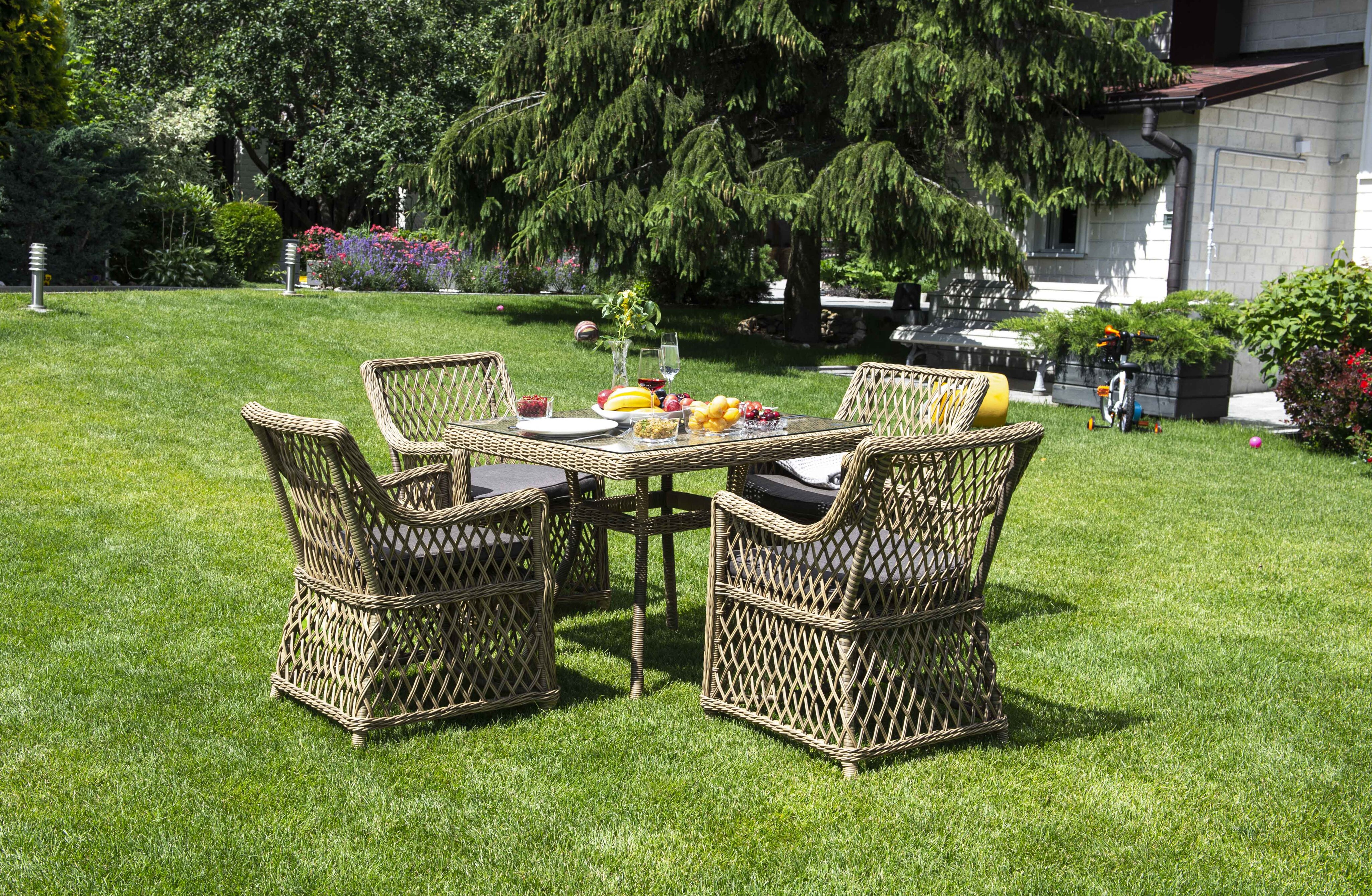 Размер садового стола: 900×900×750 мм. Его можно дополнить креслами «Латте» и создать обеденную группу для компании из 4-х человек.
