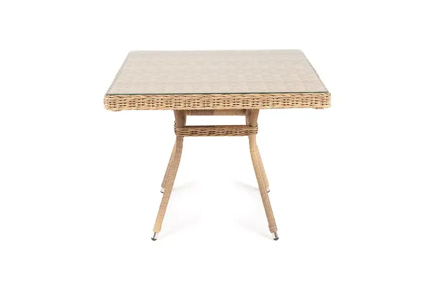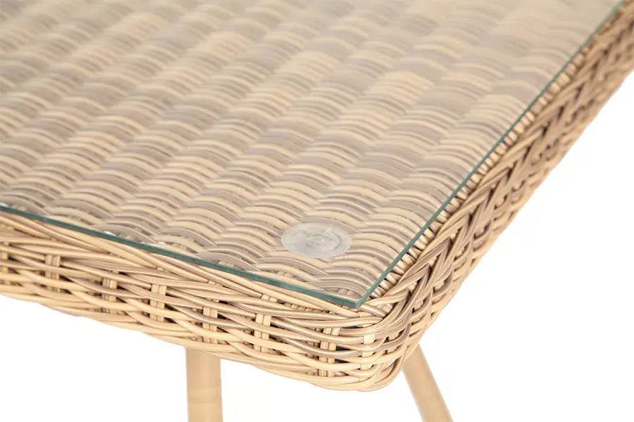 Каркас изготовлен из прочного алюминия, вручную оплетенного круглым искусственным ротангом натурального соломенного оттенка. В качестве столешницы использовано ударопрочное стекло, толщиной 5 мм. На стол можно ставить горячие тарелки и чашки, не опасаясь деформации покрытия.