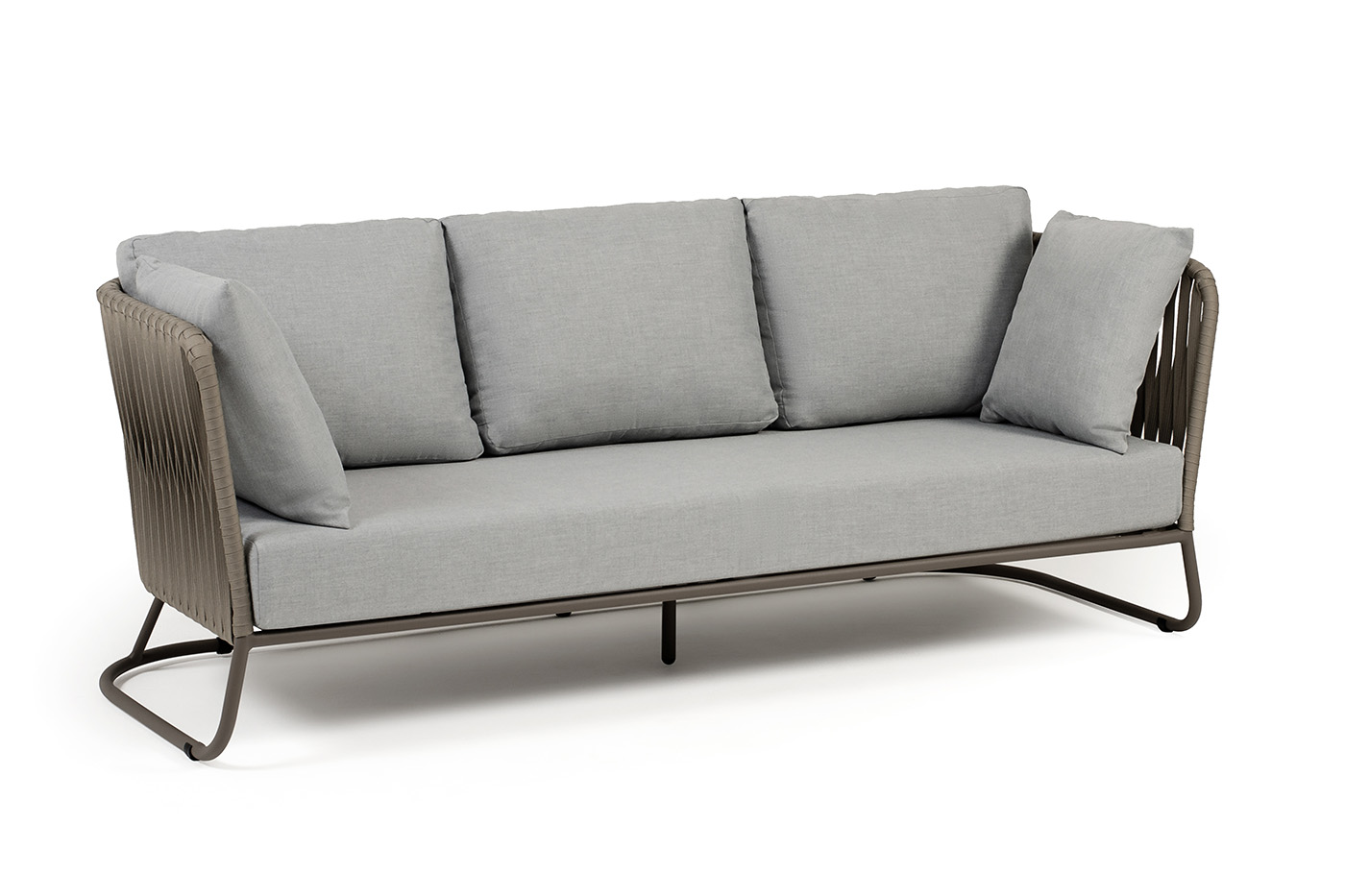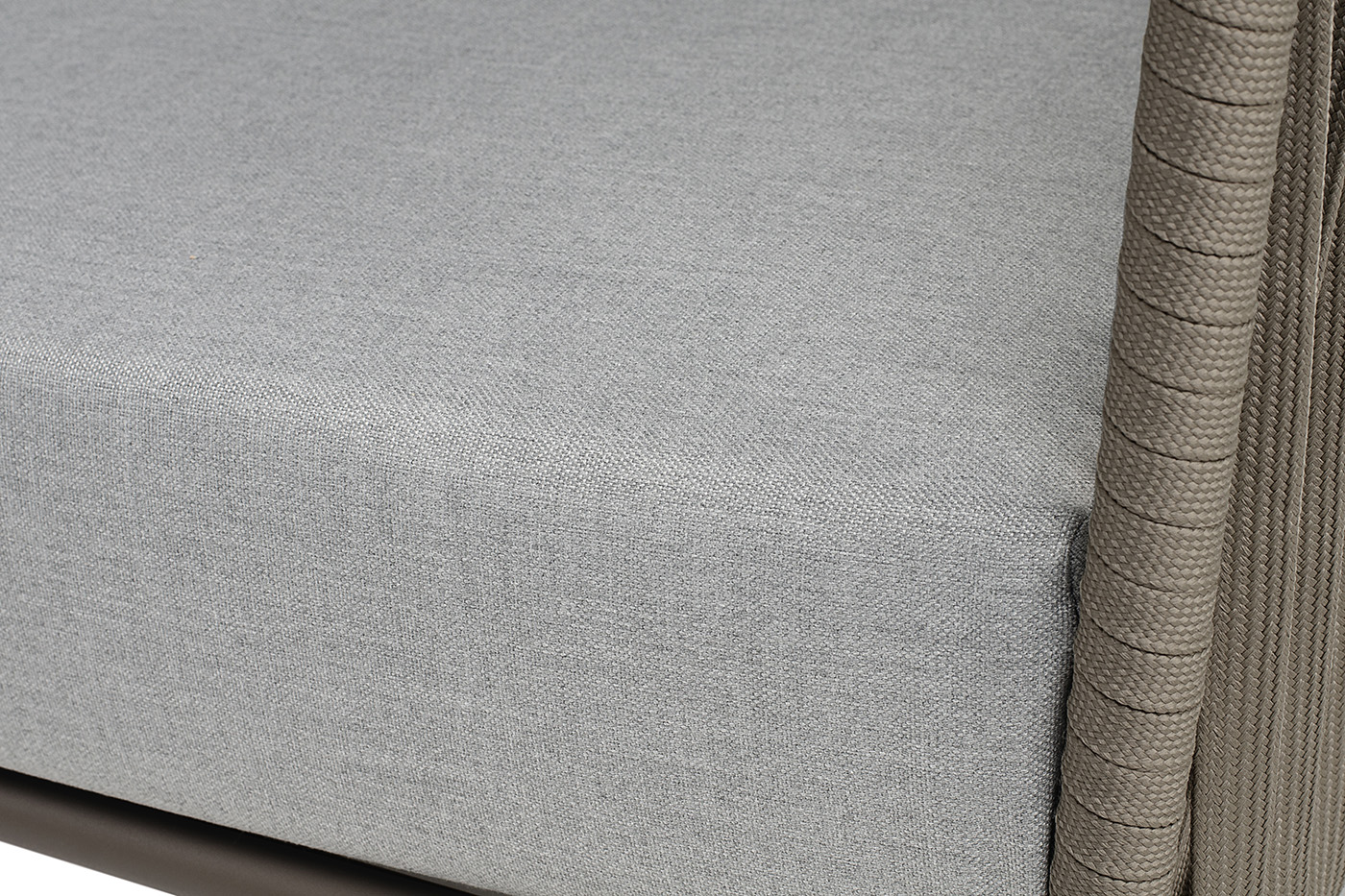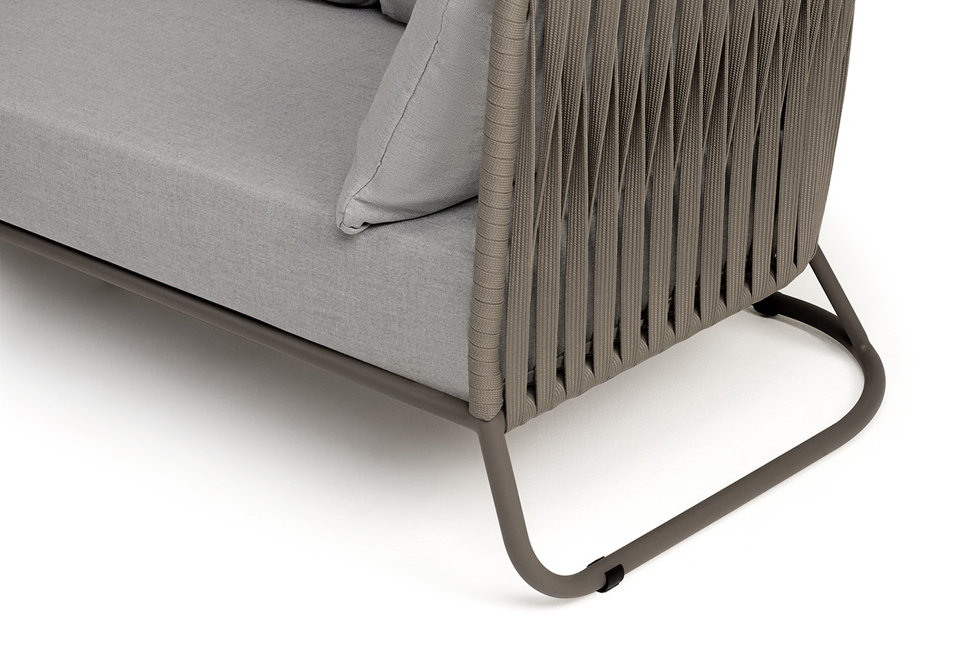 Диван имеет алюминиевый каркас, окрашенный порошковой краской в бежево-серый (RAL7006) цвет. Боковины каркаса вручную оплетены роупом - эластичными синтетическими лентами, изготовленными из высокопрочных полиэфирных волокон. Цвет оплетки - серо-коричневый.