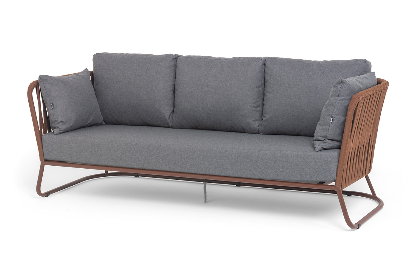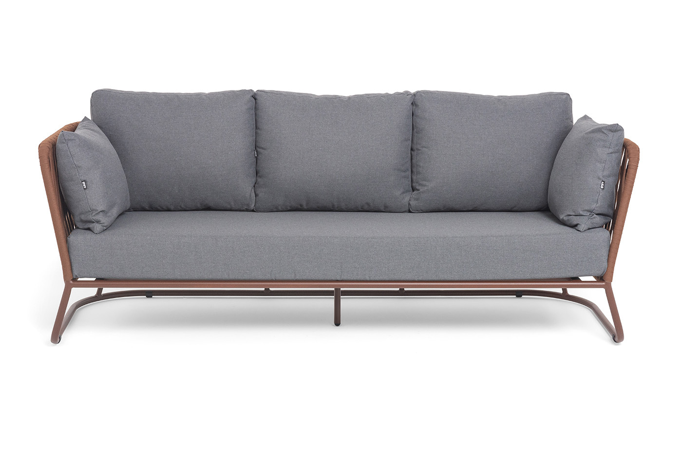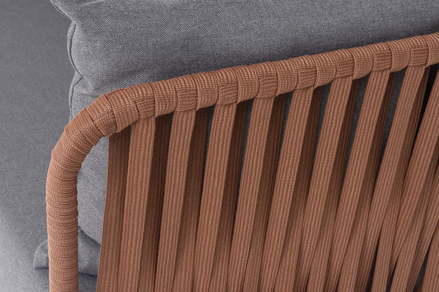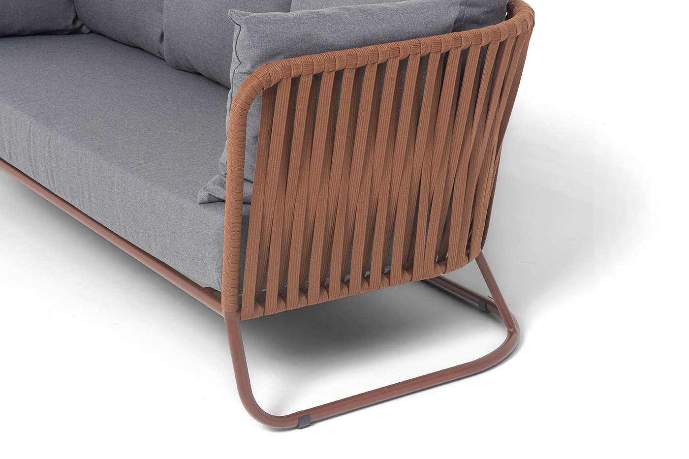 Диван имеет алюминиевый каркас, окрашенный порошковой краской в коричневый (RAL8016) цвет. Боковины каркаса вручную оплетены роупом - эластичными синтетическими лентами, изготовленными из высокопрочных полиэфирных волокон. Оплетка - 23 мм, цвет коричневый.