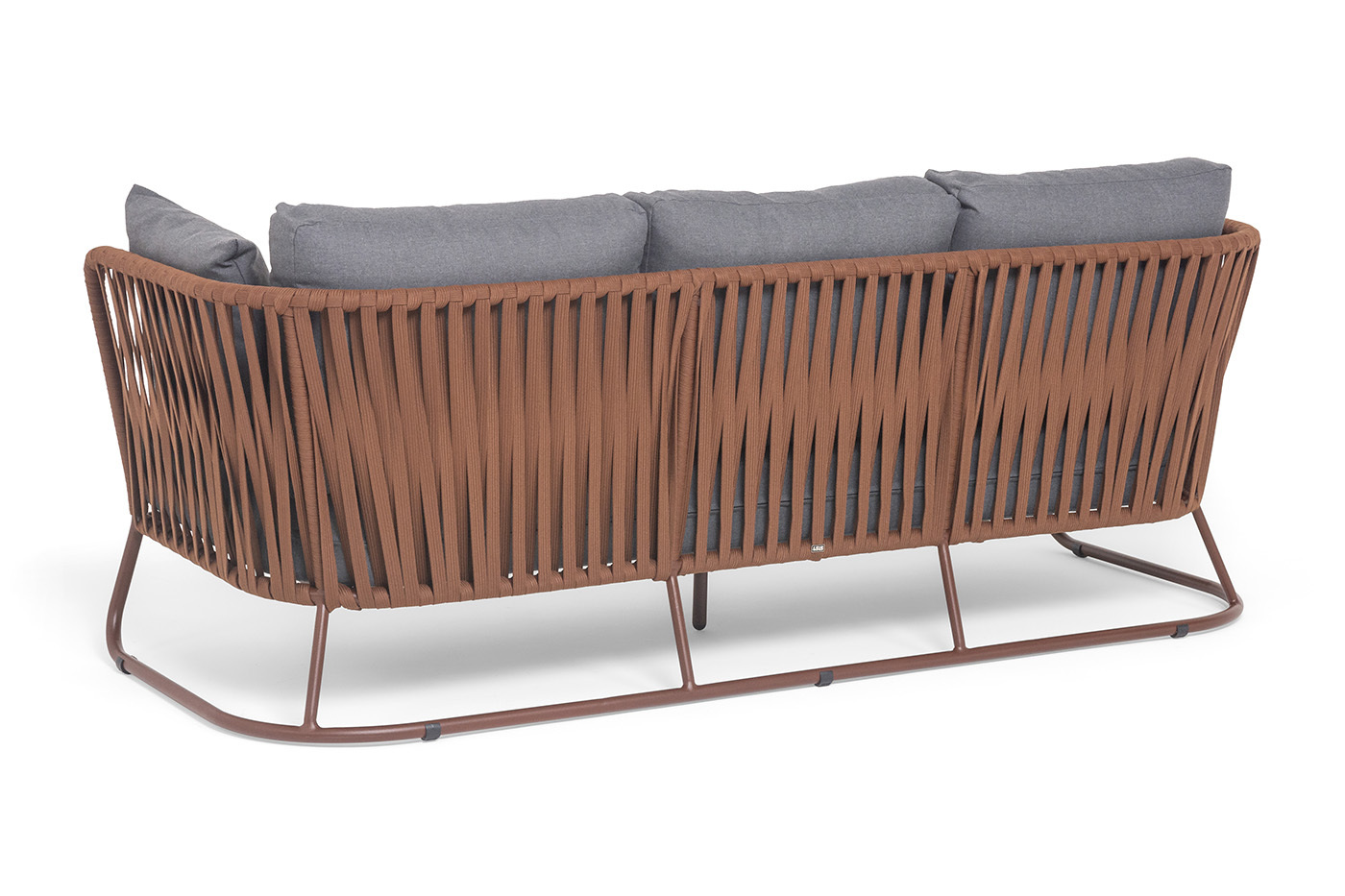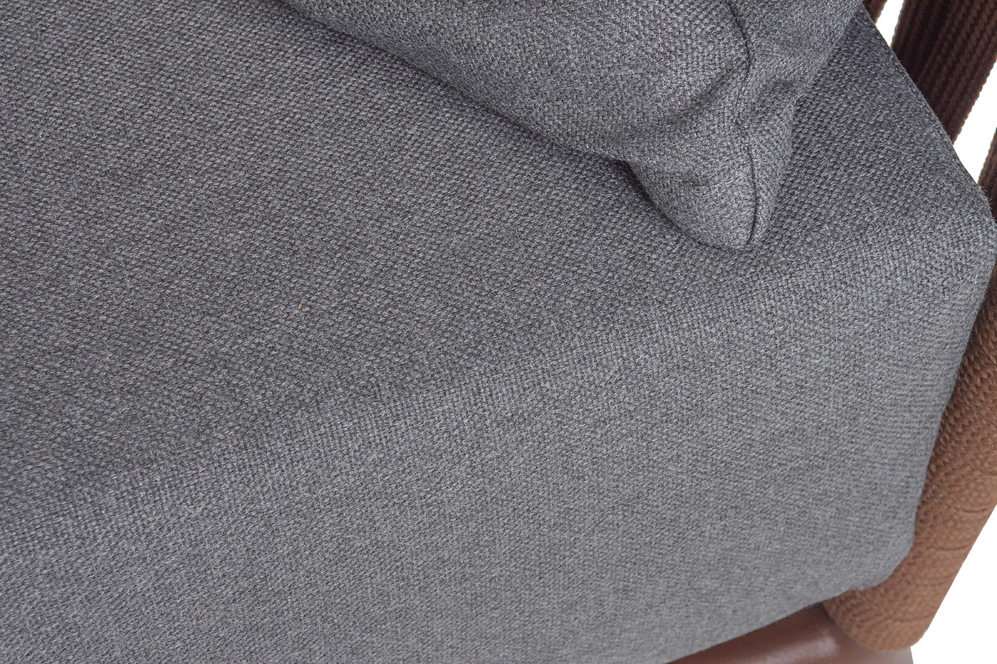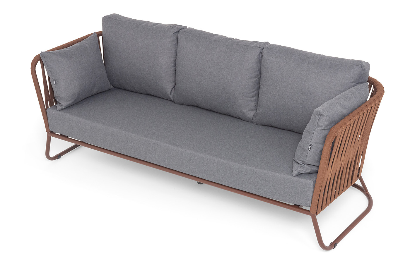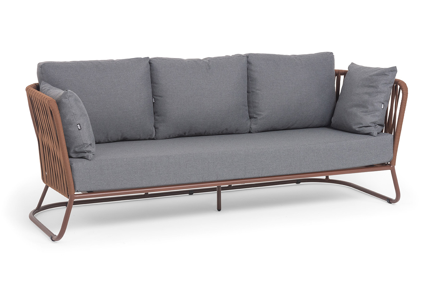Диван имеет алюминиевый каркас, окрашенный порошковой краской в коричневый (RAL8016) цвет. Боковины каркаса вручную оплетены роупом - эластичными синтетическими лентами, изготовленными из высокопрочных полиэфирных волокон. Оплетка - 23 мм, цвет коричневый.