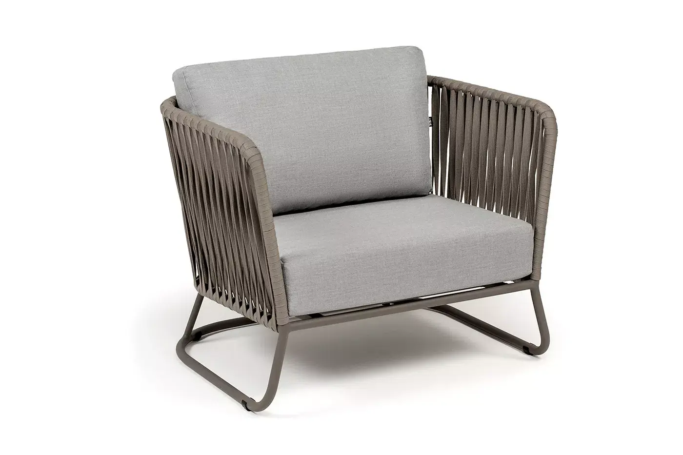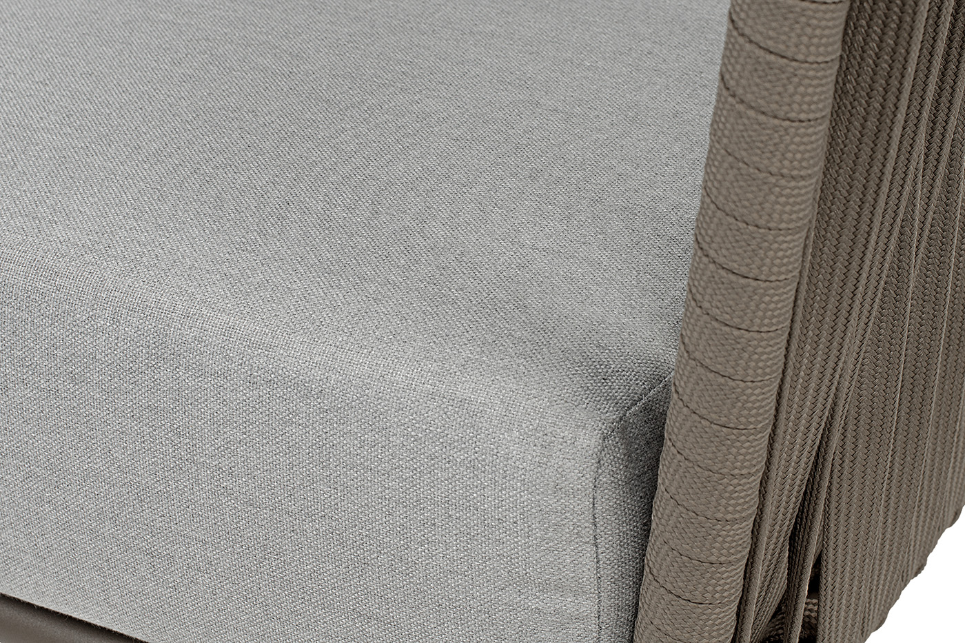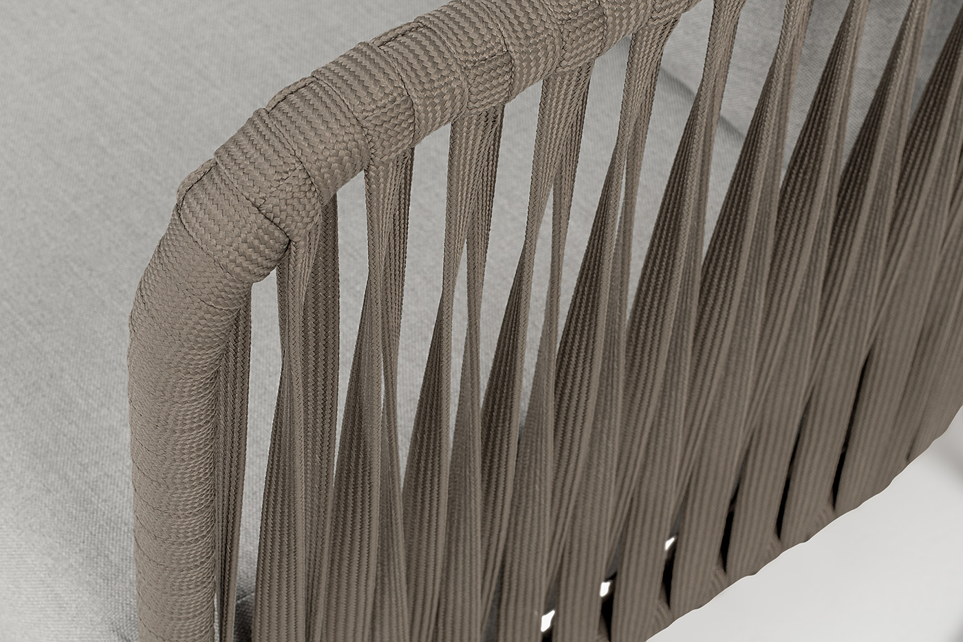 Кресло имеет алюминиевый каркас, окрашенный порошковой краской в бежево-серый (RAL7006) цвет. Боковины каркаса вручную оплетены роупом - эластичными синтетическими лентами, изготовленными из высокопрочных полиэфирных волокон. Цвет оплетки - серо-коричневый.