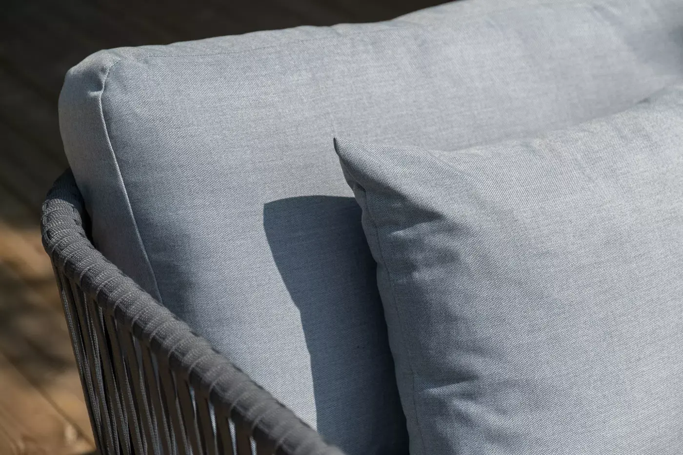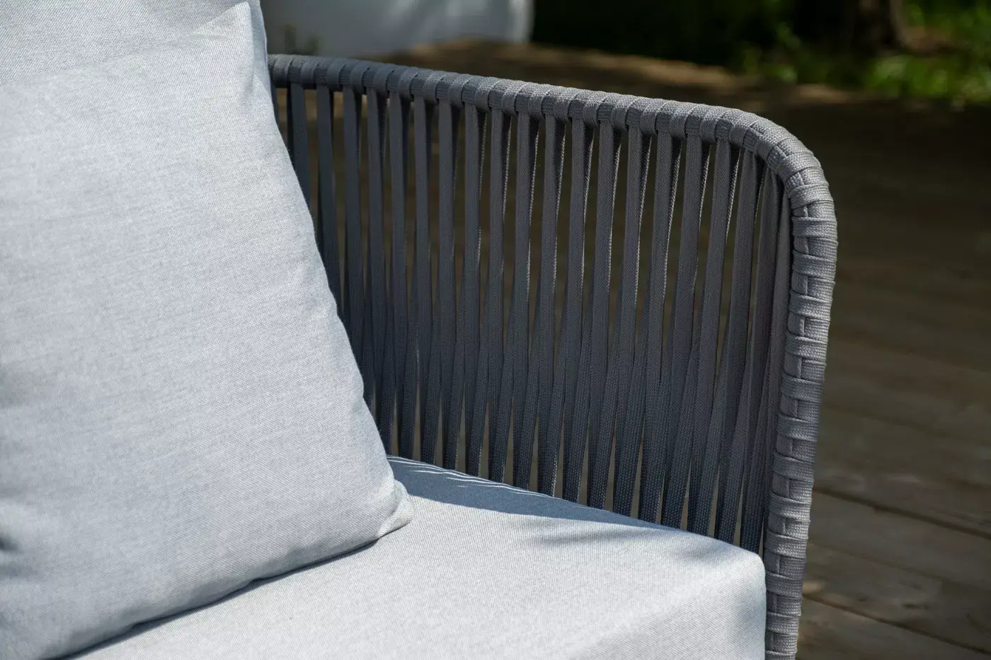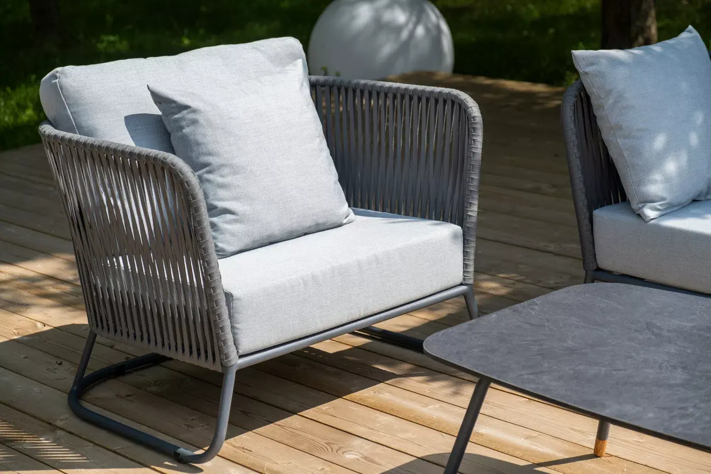 Кресло имеет алюминиевый каркас, окрашенный порошковой краской в темно-серый (RAL7024) цвет. Боковины каркаса вручную оплетены роупом - эластичными синтетическими лентами, изготовленными из высокопрочных полиэфирных волокон. Цвет оплетки - серый.
