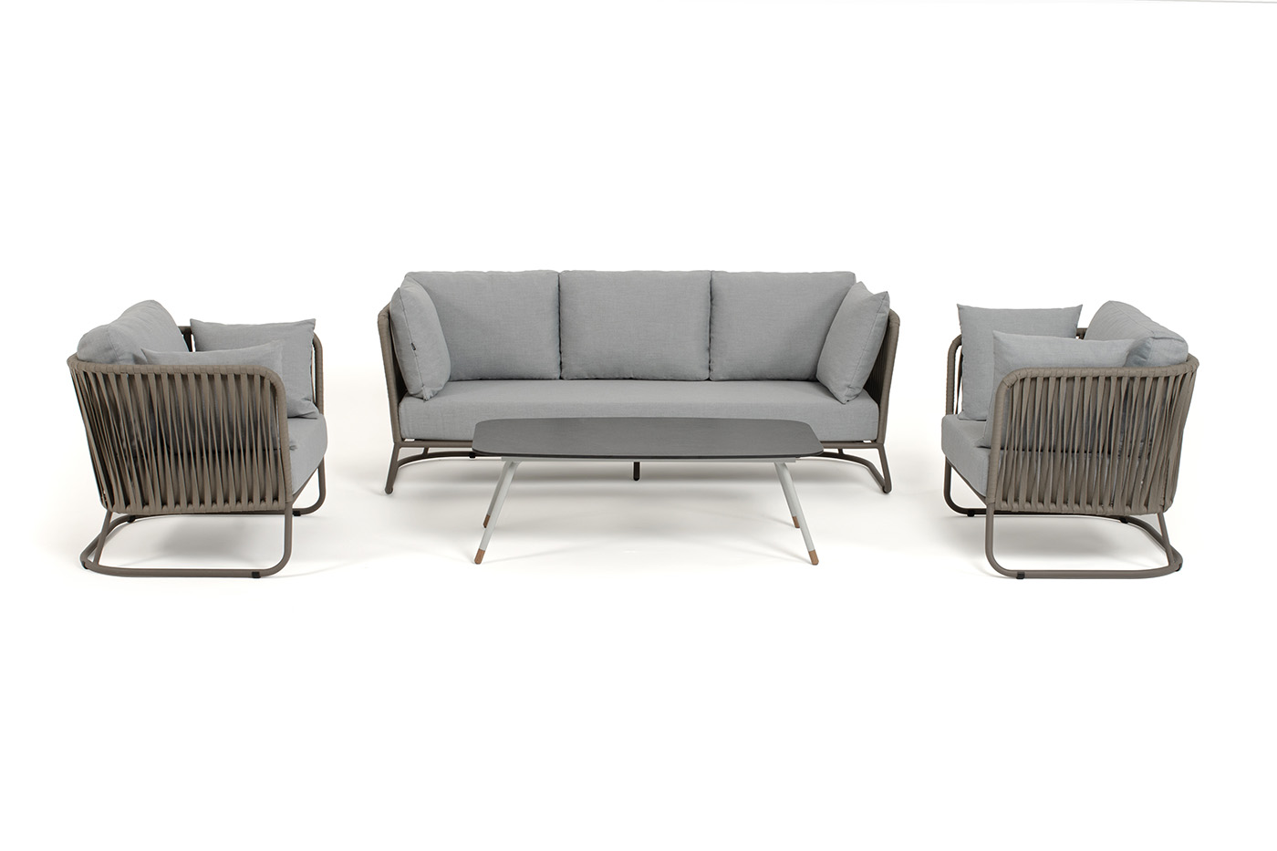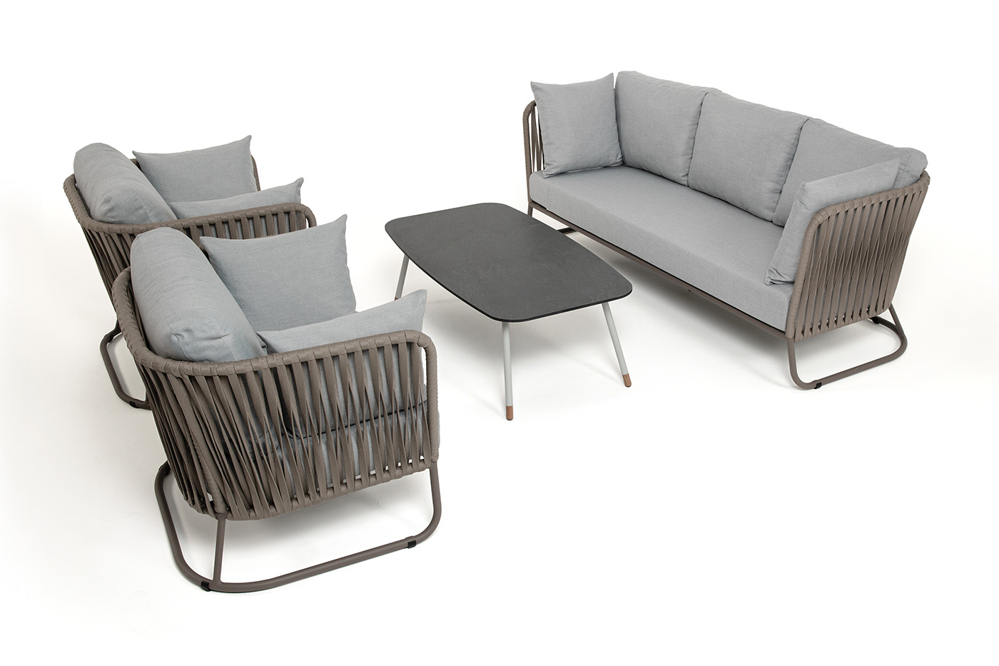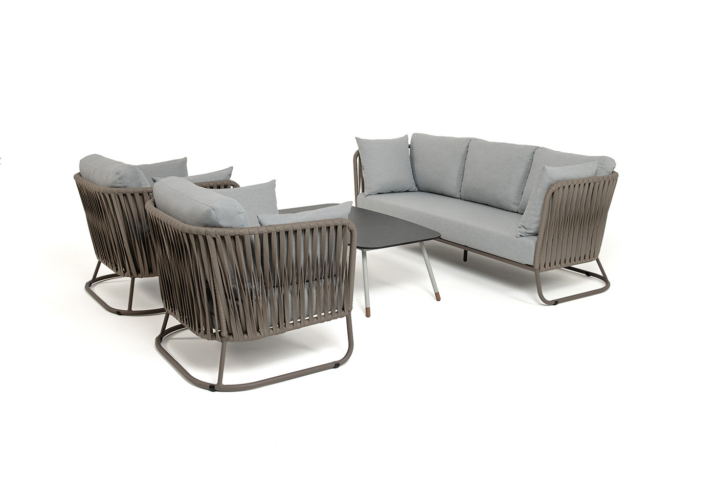 Каркас уличной мебели выполнен из износостойкого алюминия. Его дополняет серо-коричневая ручная оплетка, изготовленная на основе эластичных синтетических лент из полиэфирных волокон высокой прочности (роупа).