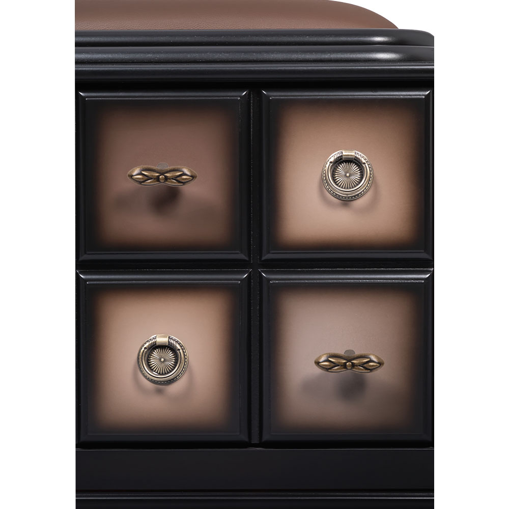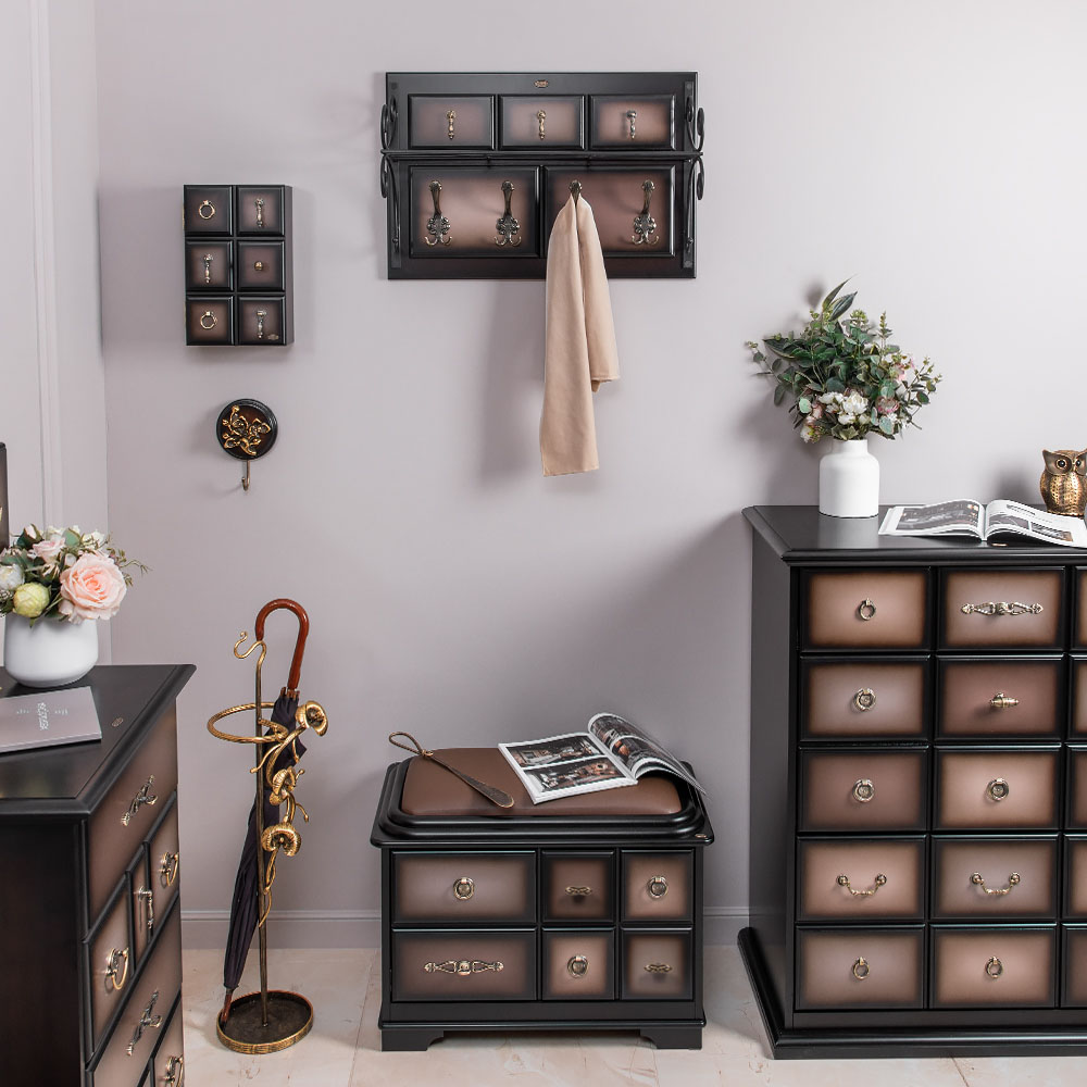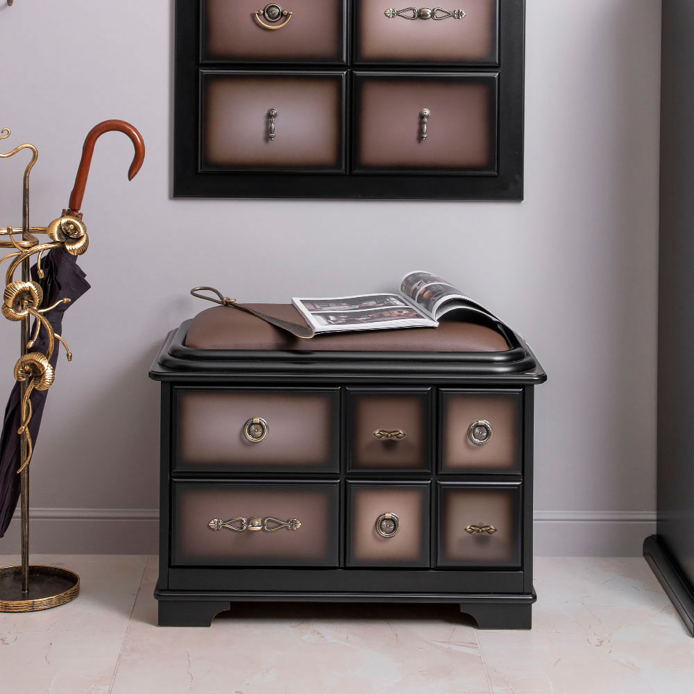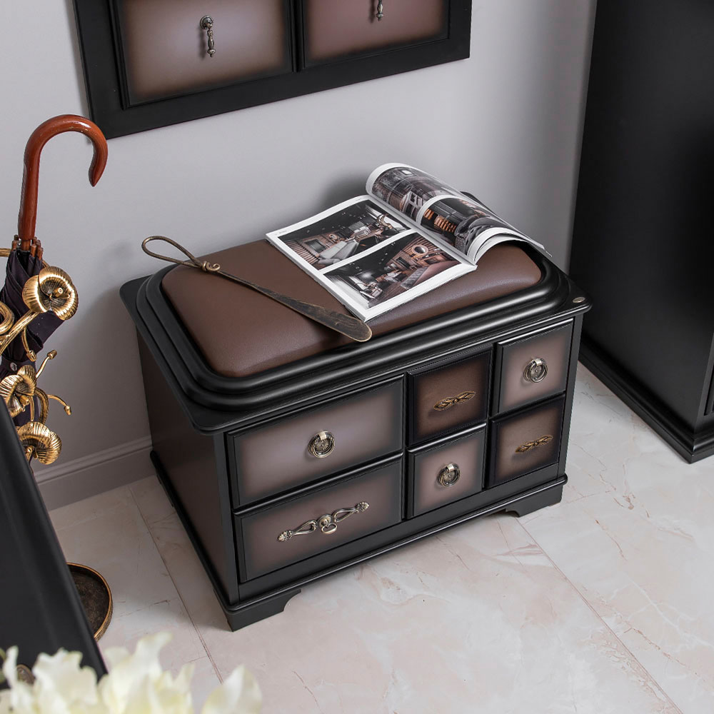 Мягкий элемент банкетки Пандора 1 с обувницей Орех Оберджин Шоколад обит текстурной тканью. Наполнителем служит холлофайбер. Ножки банкетки изготовлены из кованой стали.Изделие будет отлично смотреться в холле, гардеробной или спальне.Индивидуализируйте дизайн своего дома вместе с роскошными банкетками от BOGACHO.