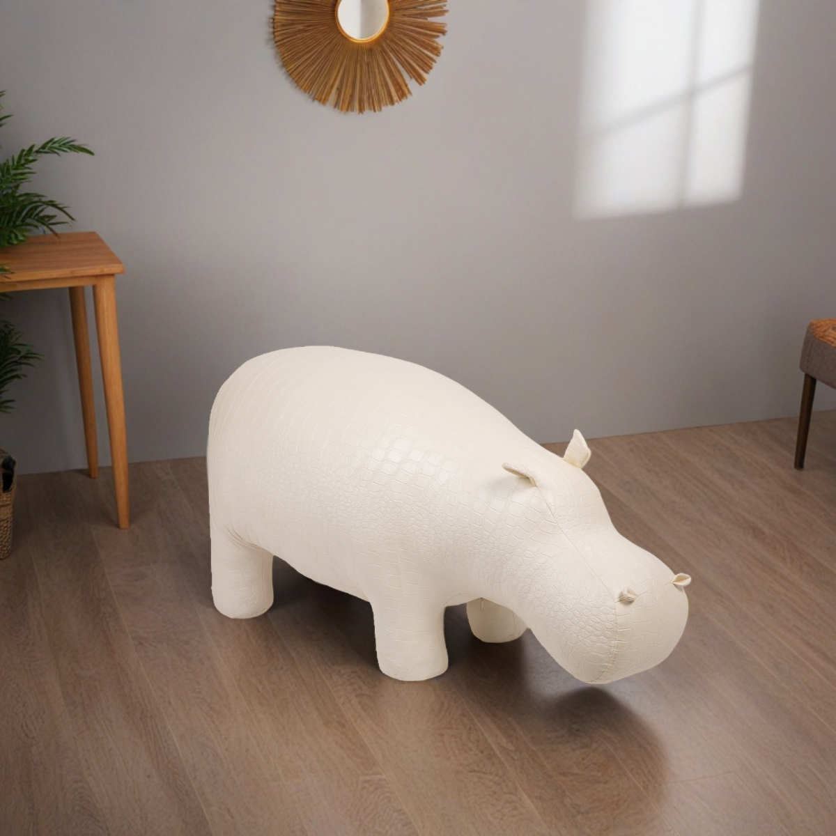 Уникальный бегемот. Этот бегемот уже стал легендой BOGACHO. Создав его, дизайнеры компании задали настоящий тренд на подобные предметы мебели. "Пуф Бегемот" - вещь оригинальная, позволяющая выйти за рамки обыденности, внести новый и неожиданный штрих не только в обстановку, но и в жизнь, заключенную, как это водится у деловых людей, в строгие рамки графиков, договоров, планов и схем. Уникальный дизайн и необычная форма пуфа позволят разместить его как в классических, так и в современных интерьерах. Терапия для взрослых. Мы выросли, стали большими, солидными и серьезными. У нас есть семья, карьера, деньги, статус, а вместе с ними ворох проблем и забот, за которыми не находится достаточно времени, чтобы по-настоящему наслаждаться жизнью, расслабиться. Садитесь на бегемота, и позвольте себе быть немного смешным и слегка беззаботным. Иногда чувствовать себя ребенком - это полезно, любой психолог вам это подтвердит! Делайте счастливыми других. Психологи также знают еще один важный секрет: нужно обязательно приносить счастье другим, тогда и твоя собственная жизнь расцветет яркими жизнерадостными красками. Поэтому "Пуф Бегемот" будет отличным подарком! Взрослым знакомым вы тем самым дадите возможность напитаться новыми положительными эмоциями, которые помогут снять стрессы и депрессии. И только представьте себе, сколько часов могут провести с бегемотом дети, лучшей и более необычной забавы представить сложно! Качественно. Превосходно. Безопасно. Пуф совершенно безопасен: округлые формы, мягкий обивочный материал вызывает только приятные тактильные ощущения. В банкетке используют металлокаркас обеспечивающий изделию прочность, благодаря чему он способен выдержать до 120 кг. веса. Пуф выполнен из экологически чистого заменителя кожи, благодаря чему материал «дышит», но при этом не пропускает влагу. В качестве наполнителя используют холлофайбер.