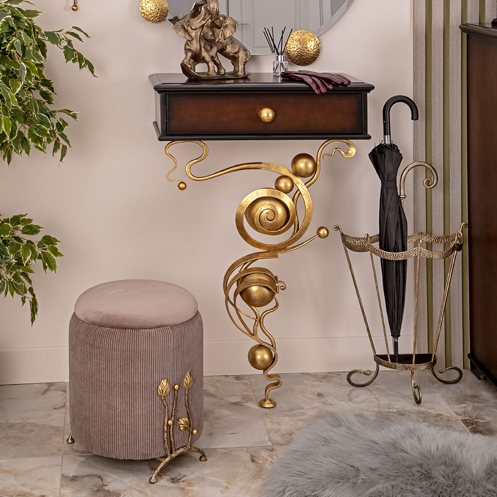 Каркас банкетки изготовлен из прочного и лёгкого материала МДФ. Изящные веточки с листочками выкованы из стали вручную и декорированы в технике патинирование. Мягкая тканевая обивка обеспечит Вам идеальный комфорт.