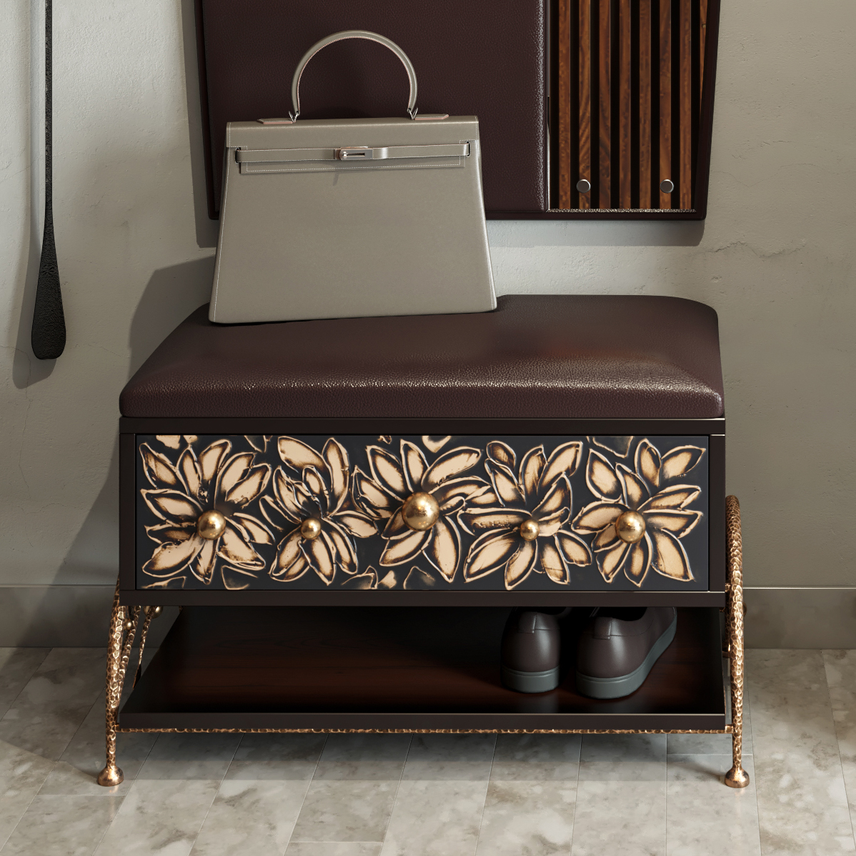 Мягкий элемент банкетки Терра Каштан Амбер обит текстурной тканью. Наполнителем служит холлофайбер. Ножки банкетки изготовлены из кованой стали.Изделие будет отлично смотреться в холле, гардеробной или спальне.Индивидуализируйте дизайн своего дома вместе с роскошными банкетками от BOGACHO.