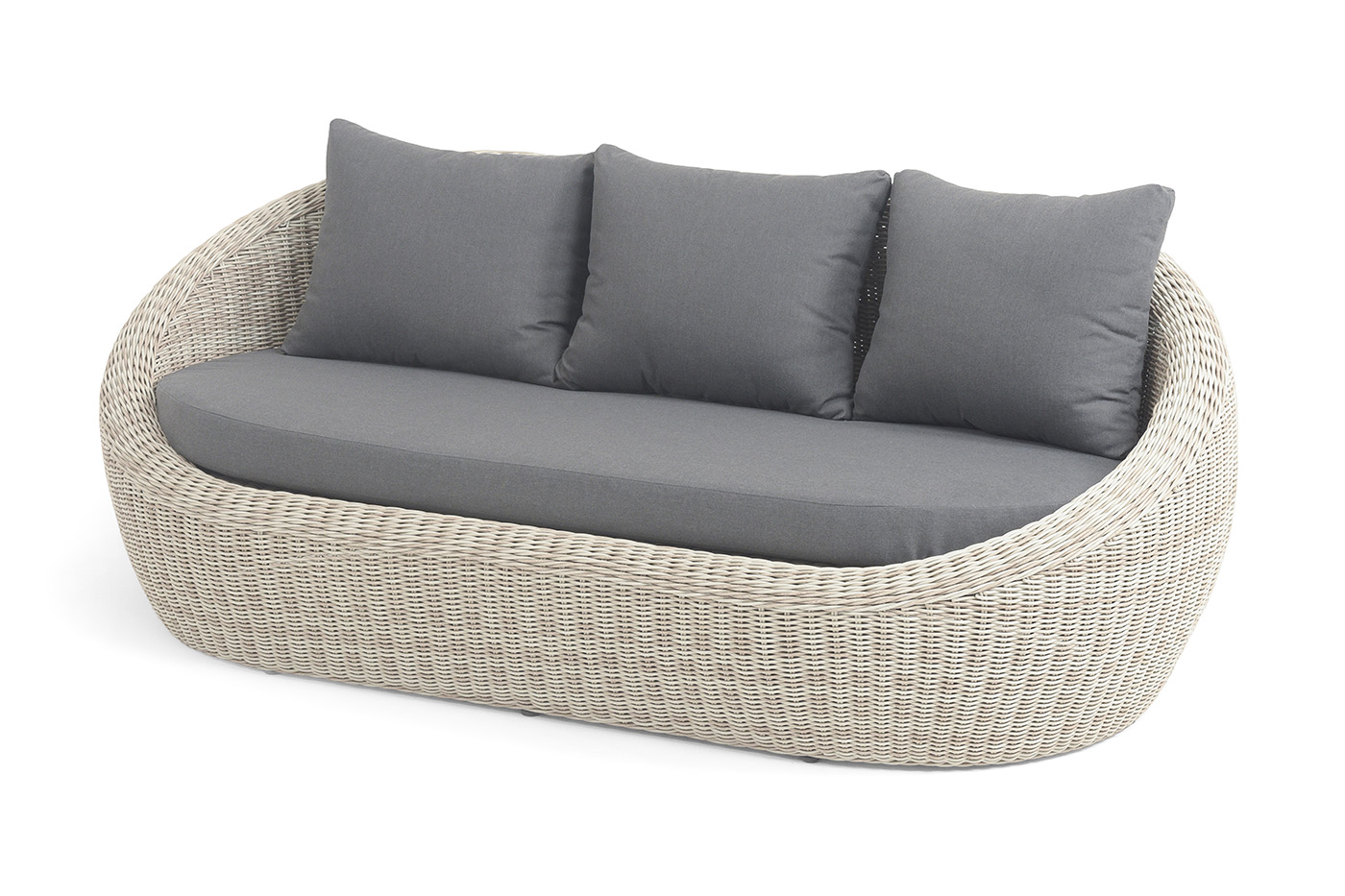 Трехместный диван дополняют мягкие подушки в сером цвете со съёмными чехлами. Тканевые изделия выполнены из прочного полиэстера плотностью 300гр/м2. Материал имеет влагоотталкивающую пропитку.