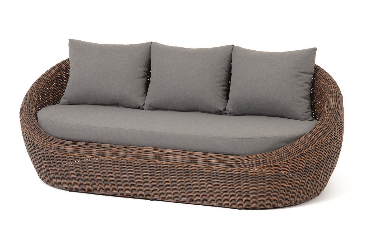 Трехместный диван дополняют мягкие подушки в сером цвете со съёмными чехлами. Тканевые изделия выполнены из прочного полиэстера плотностью 300гр/м2. Материал имеет влагоотталкивающую пропитку.