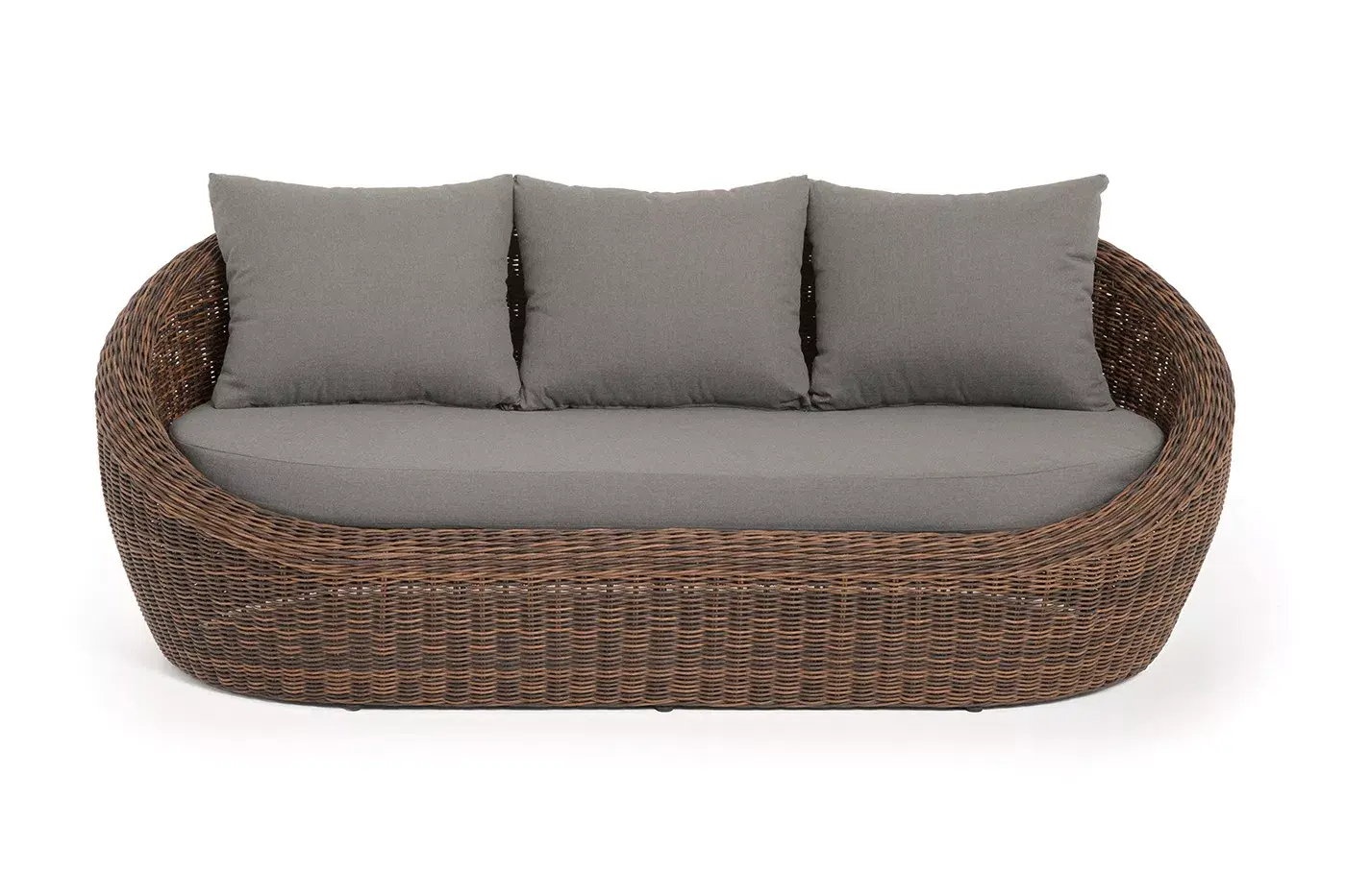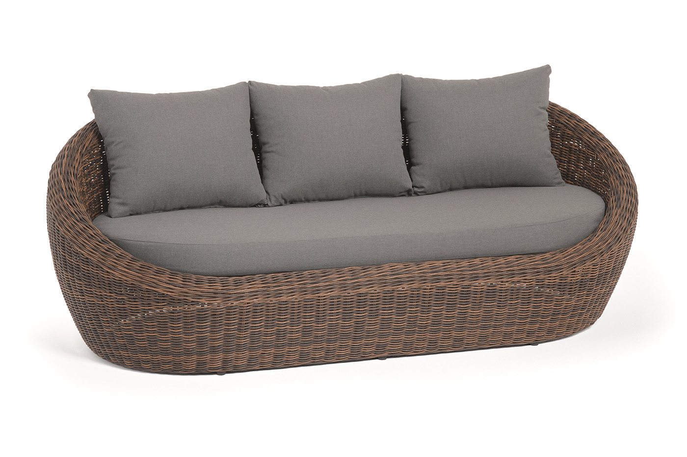 Трехместный диван дополняют мягкие подушки в сером цвете со съёмными чехлами. Тканевые изделия выполнены из прочного полиэстера плотностью 300гр/м2. Материал имеет влагоотталкивающую пропитку.
