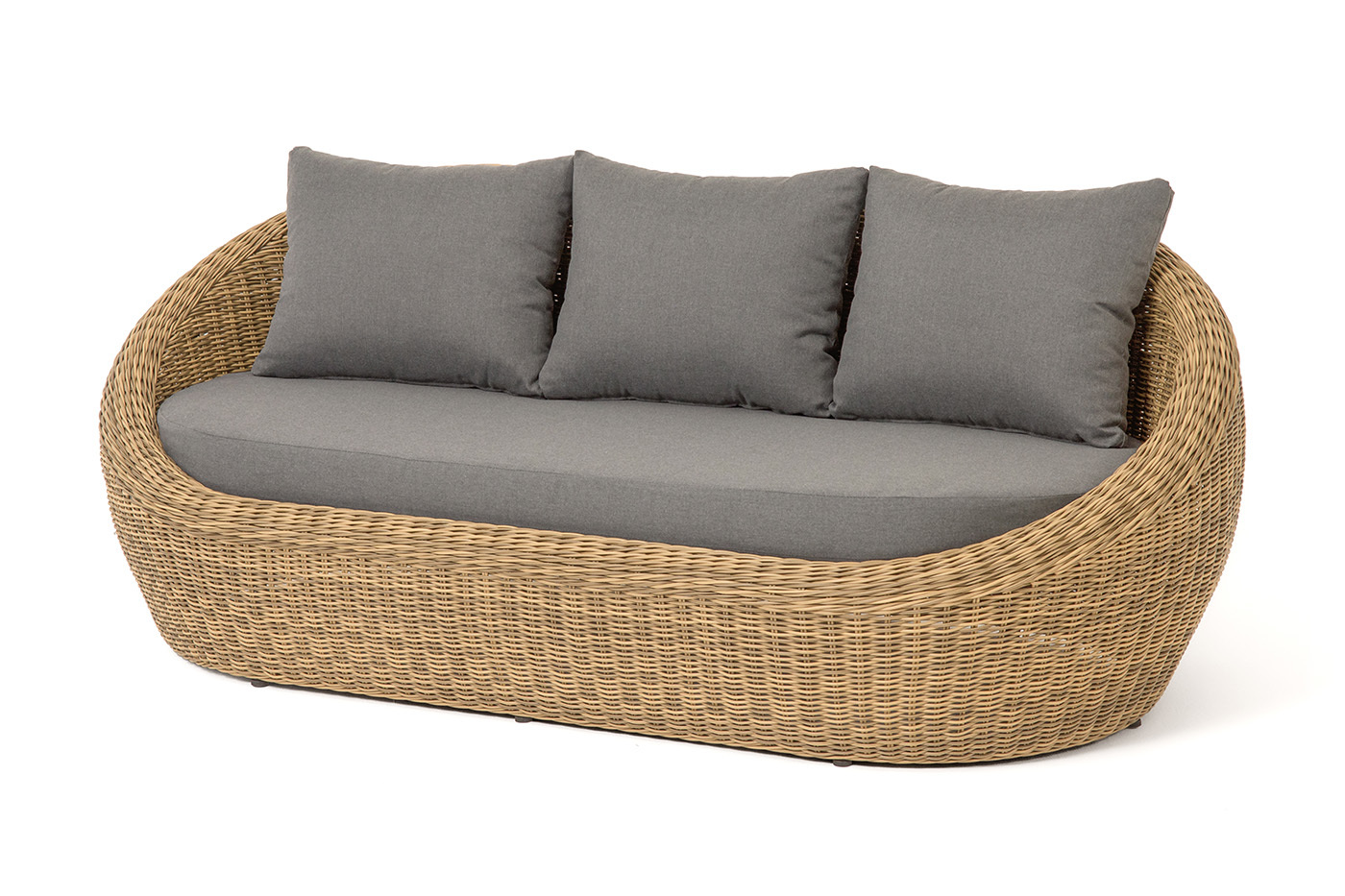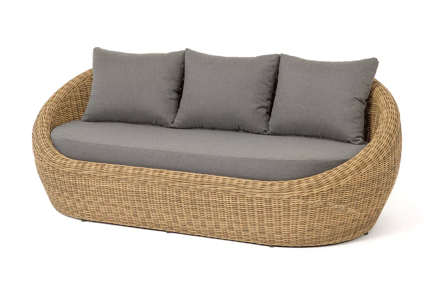 Трехместный диван дополняют мягкие подушки в сером цвете со съёмными чехлами. Тканевые изделия выполнены из прочного полиэстера плотностью 300гр/м2. Материал имеет влагоотталкивающую пропитку.