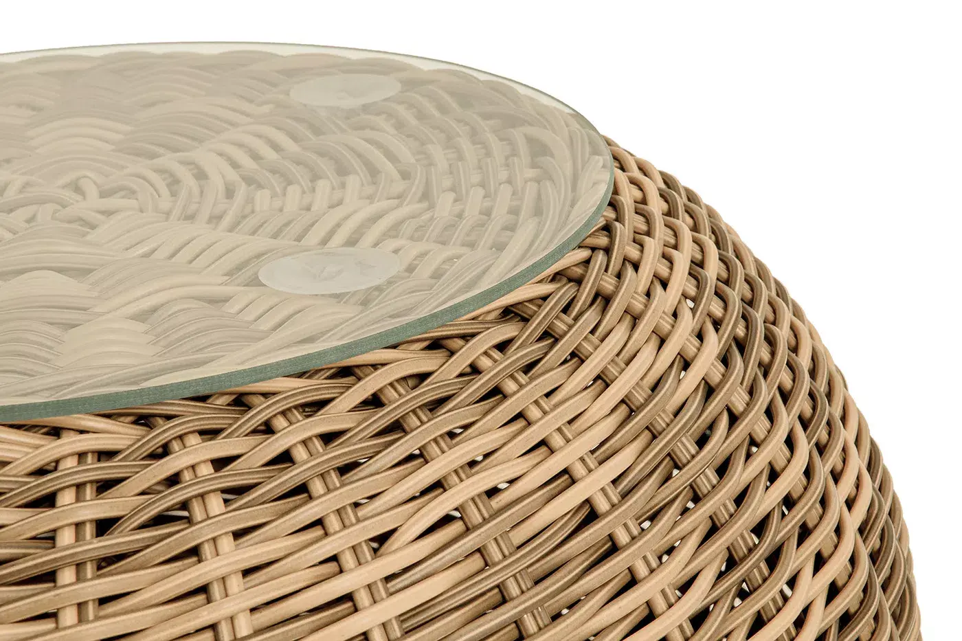 Каркас изготовлен из легкого алюминия и оплетен искусственным ротангом натурального соломенного оттенка. Поверхность столика дополнена стеклянной столешницей из закаленного стекла, толщиной 5 мм.