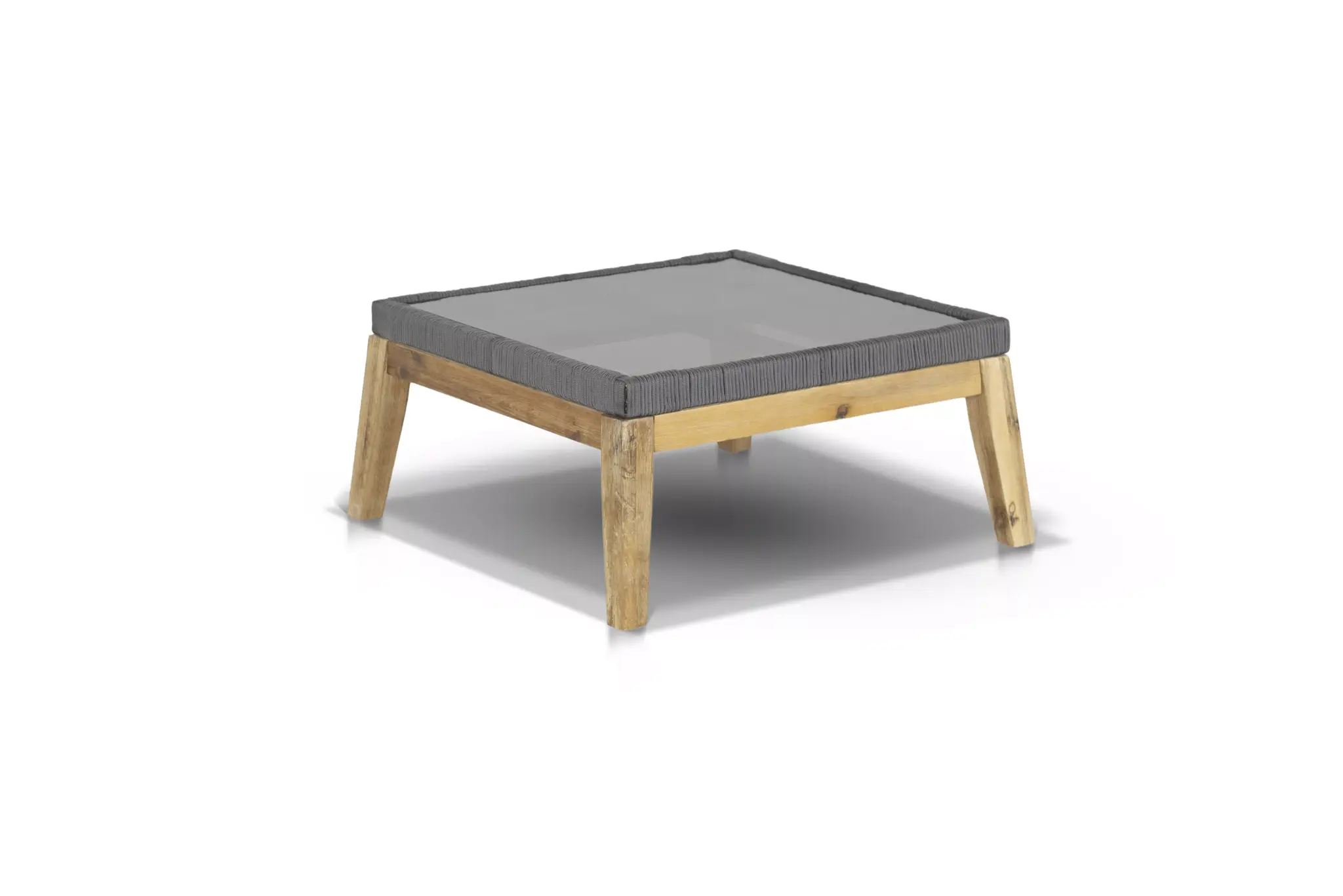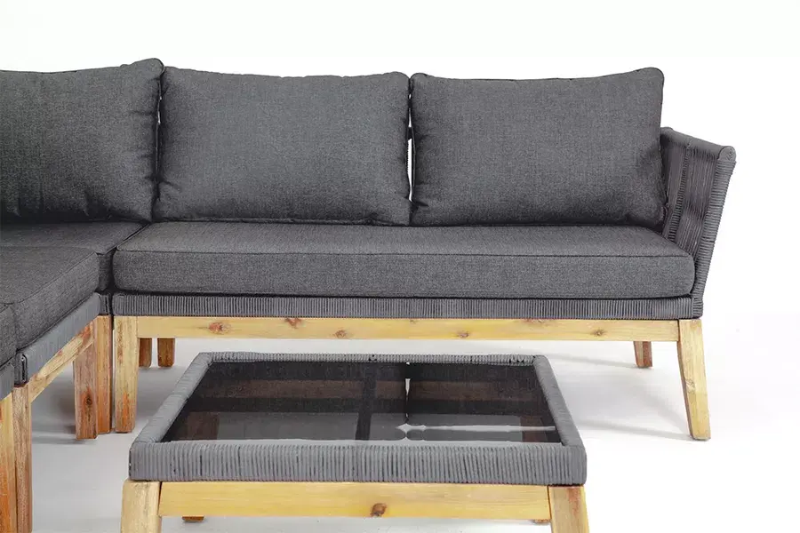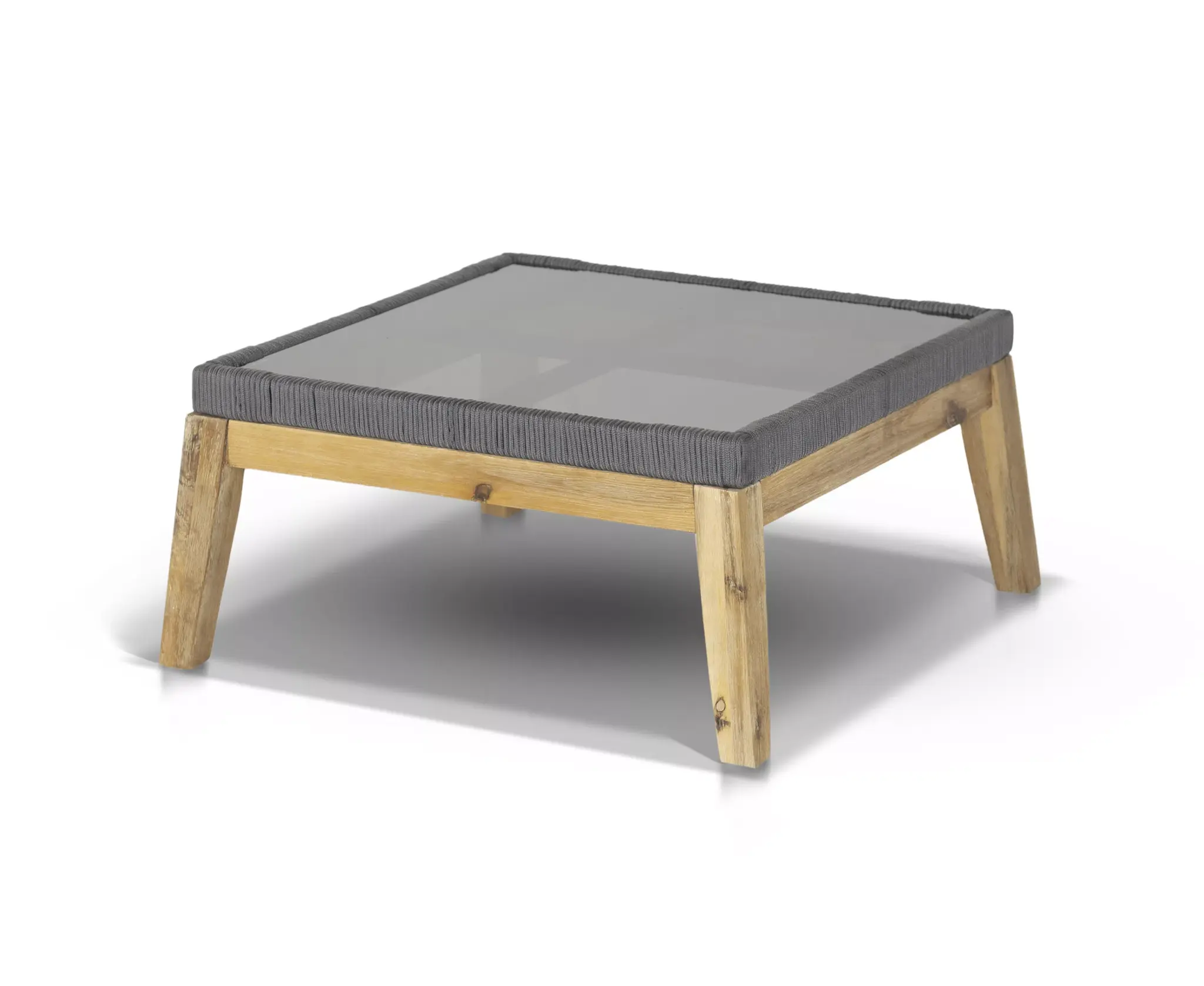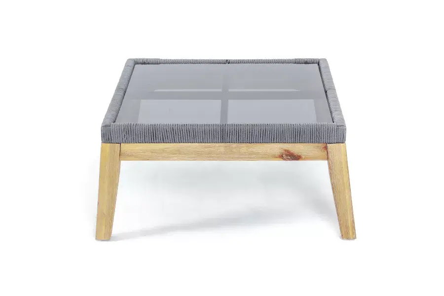 На деревянном каркасе кофейного столика закреплена столешница из высокопрочного стекла, которое имеет устойчивость к случайным повреждениям. Толщина столешницы достигает 5 мм. По краям столешница задекорирован эластичными синтетическими лентами серого цвета.