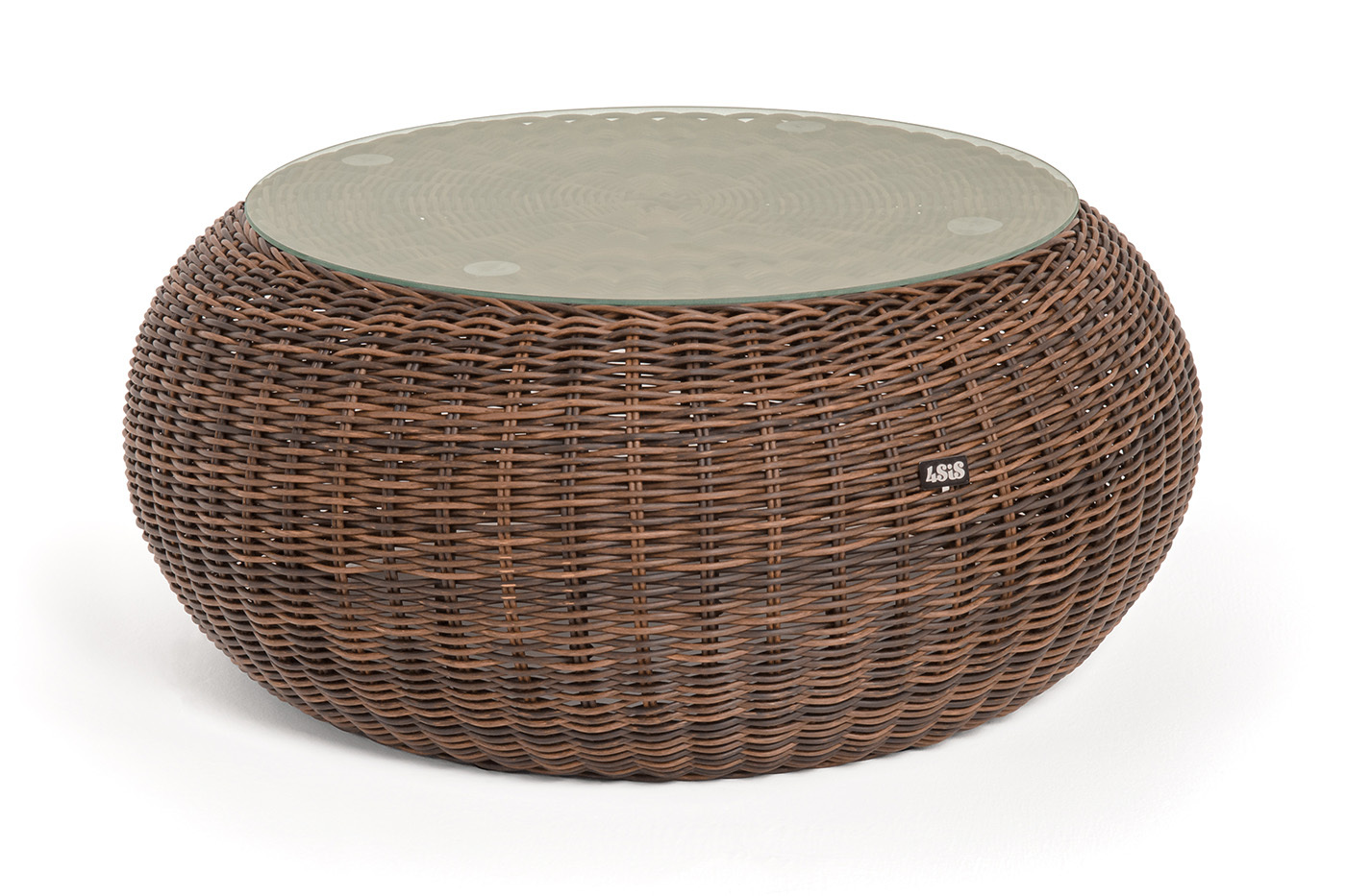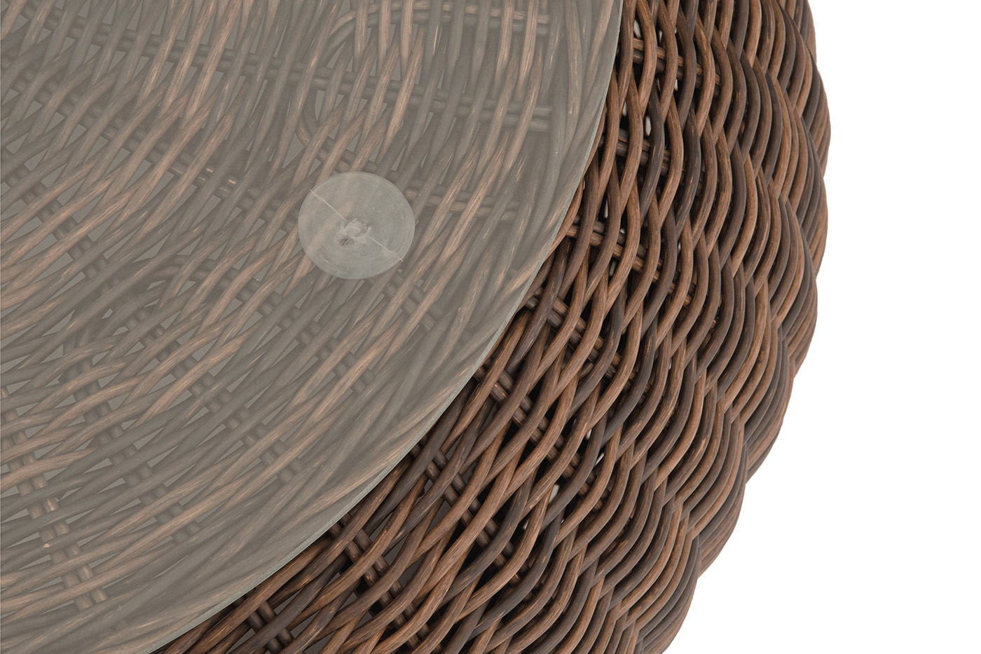 Каркас столика изготовлен из алюминия, вручную оплетенного круглым искусственным ротангом.