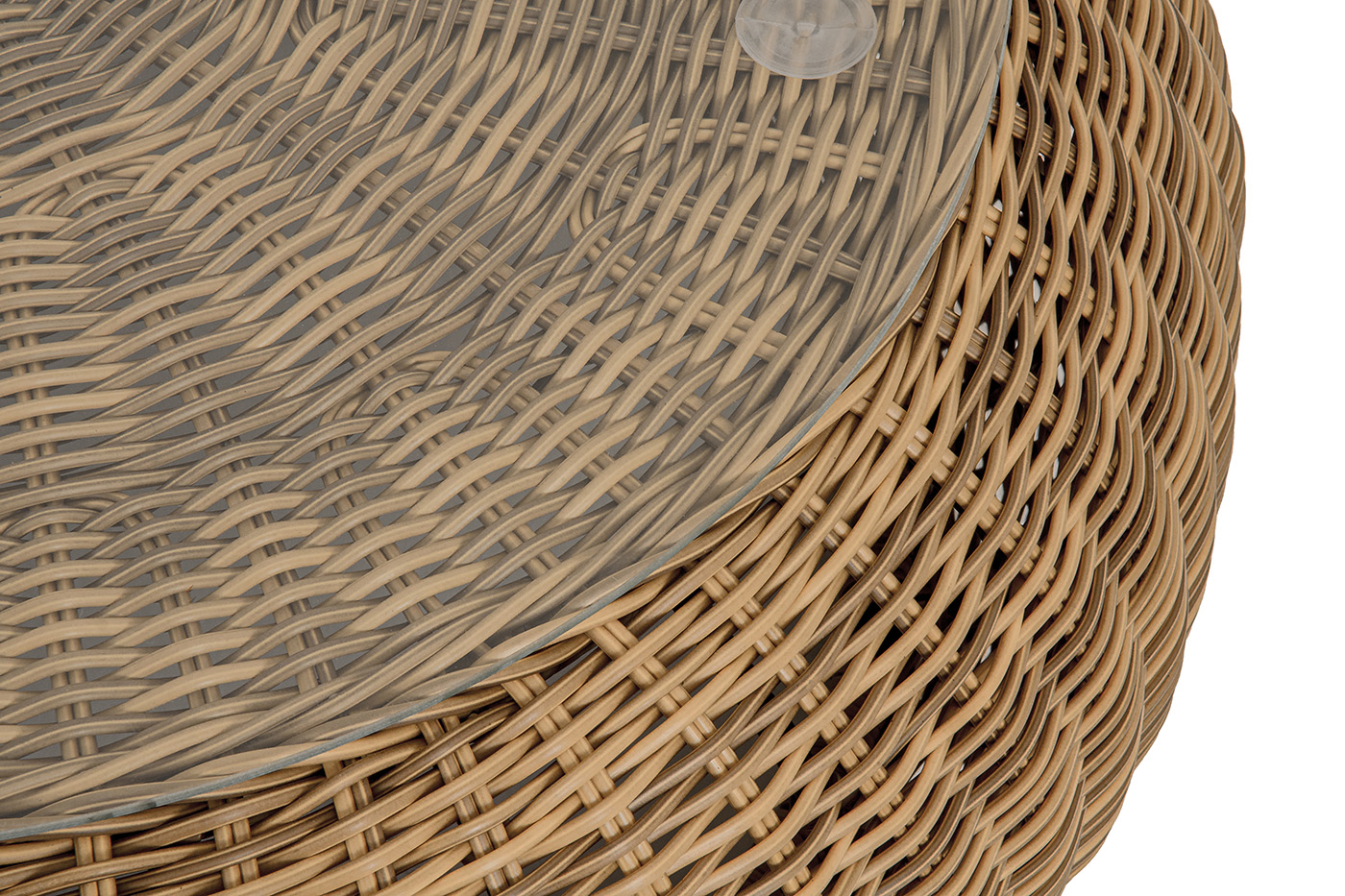 Каркас столика изготовлен из алюминия, вручную оплетенного круглым искусственным ротангом.