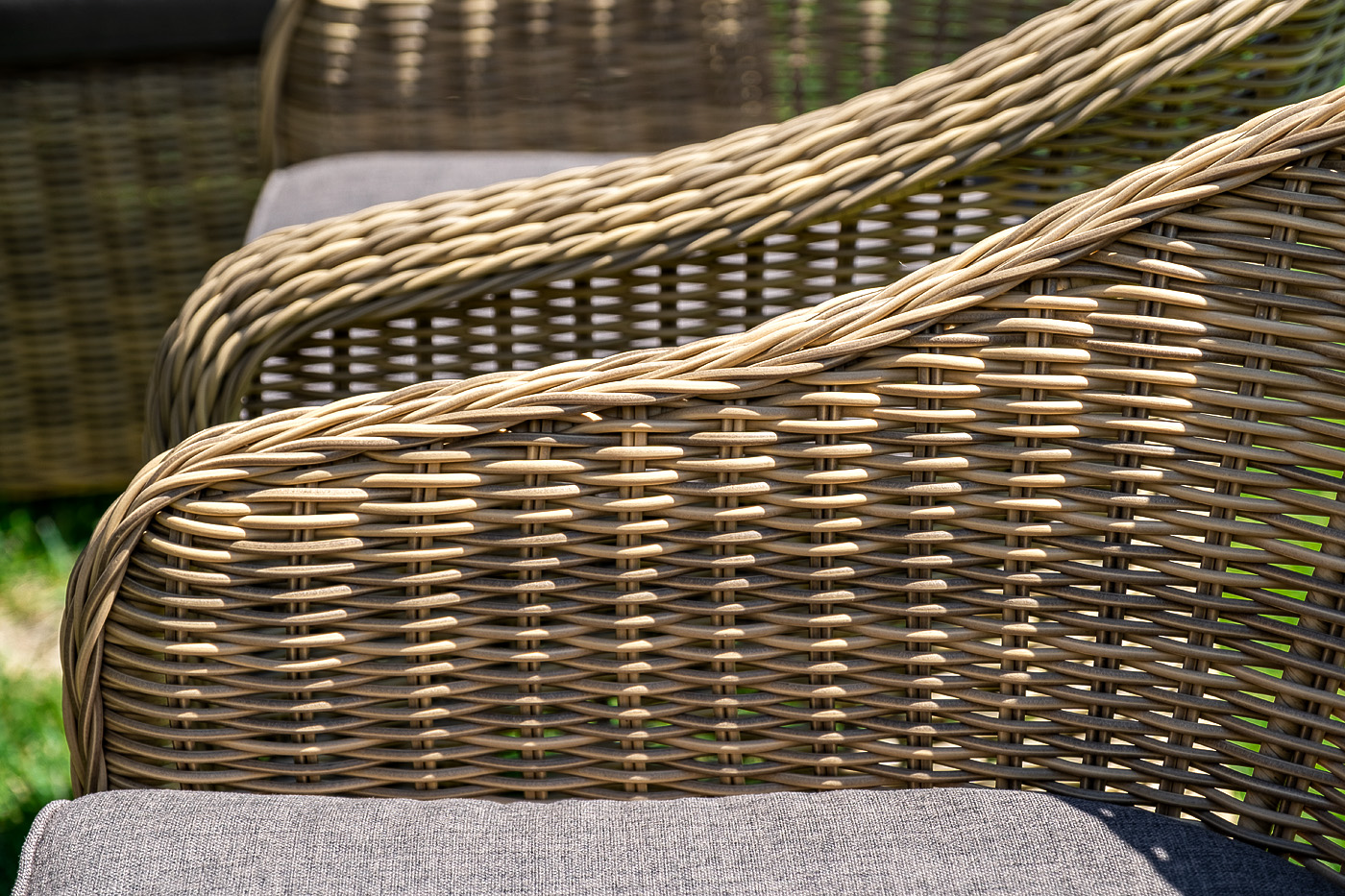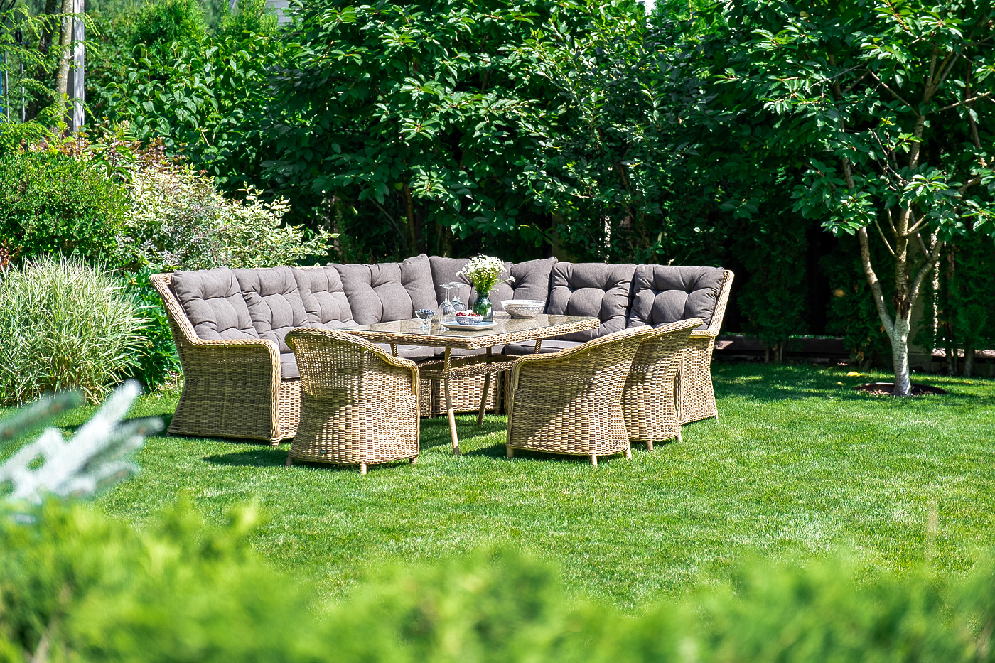 Угловая модульная лаунж зона с обеденным столом и тремя стульями. Искусственный ротанг, плетение круглое, цвет соломенный, алюминиевый каркас. Столешница из закаленого стекла 5 мм.
