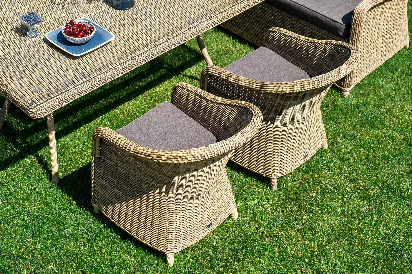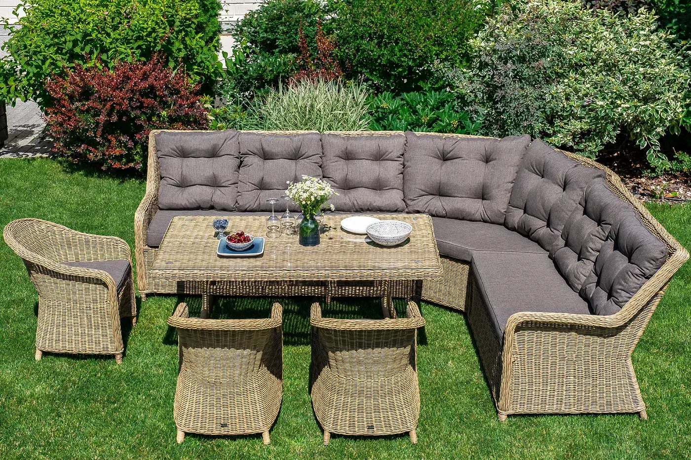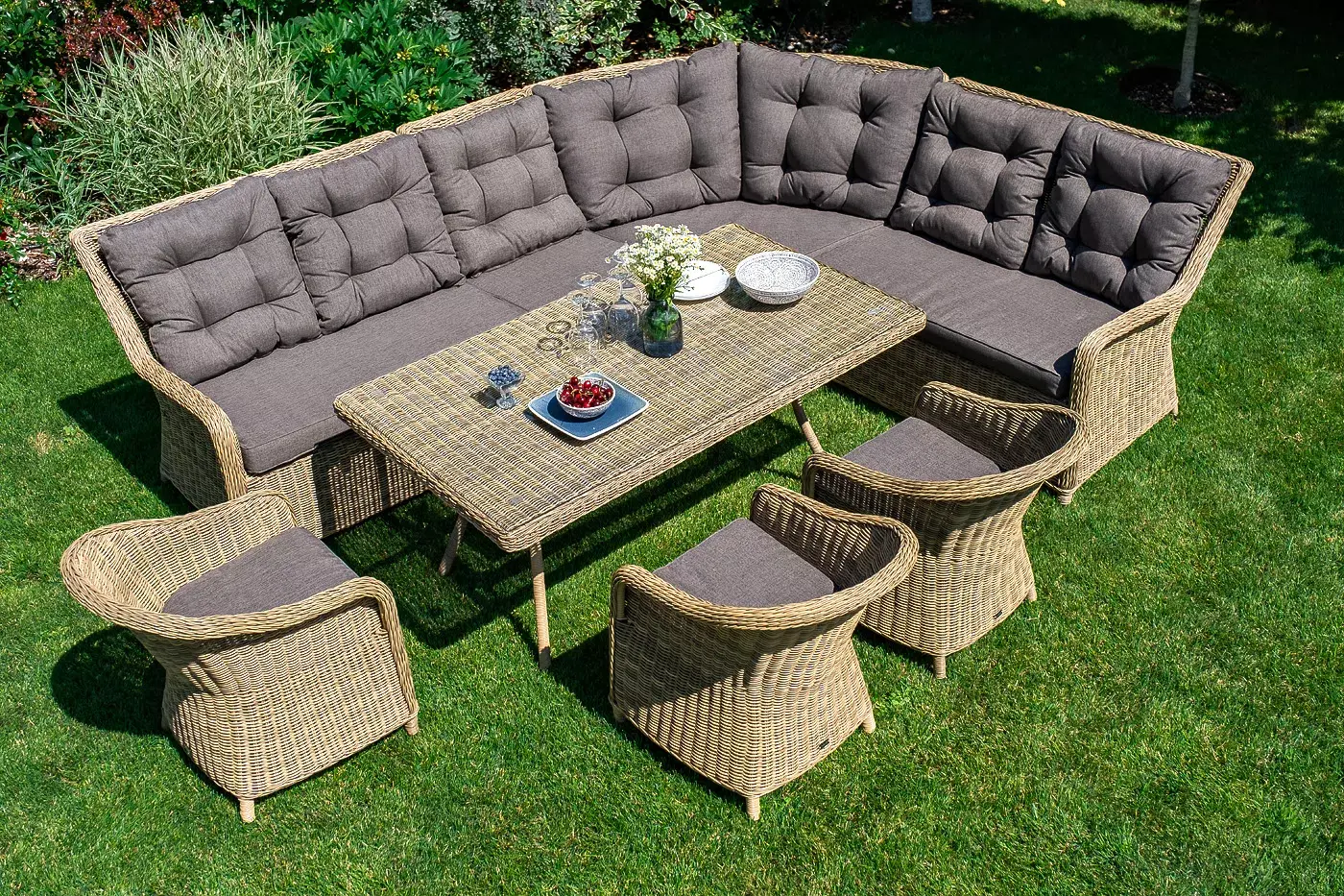 Угловая модульная лаунж зона с обеденным столом и тремя стульями. Искусственный ротанг, плетение круглое, цвет соломенный, алюминиевый каркас. Столешница из закаленого стекла 5 мм.