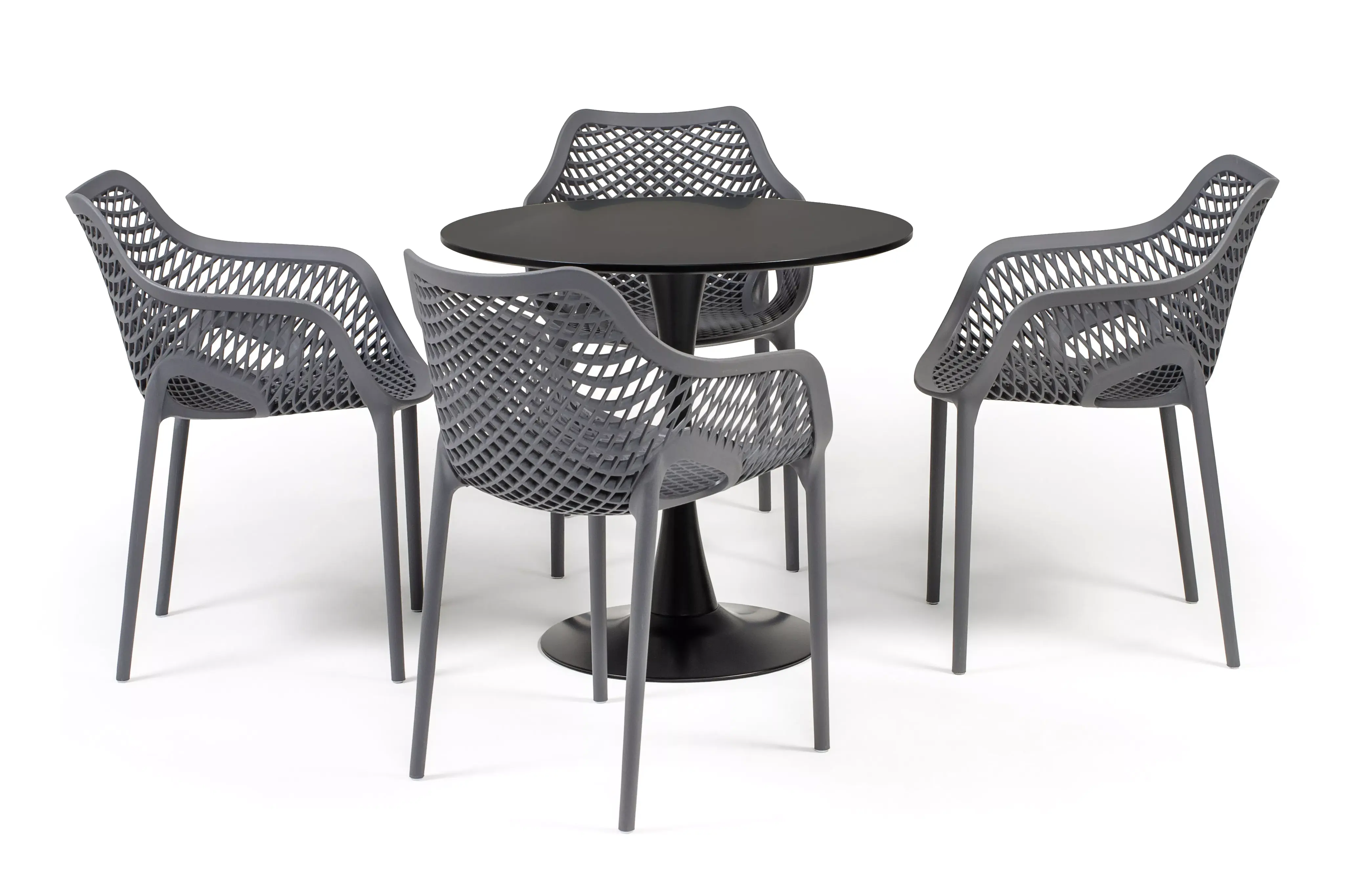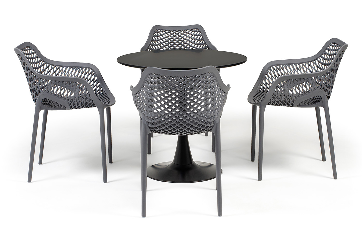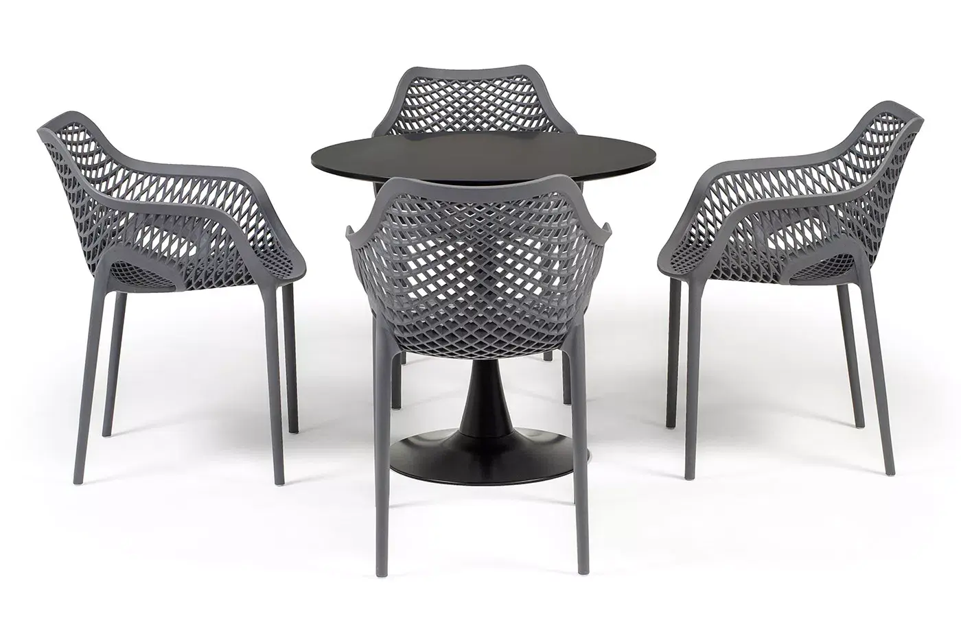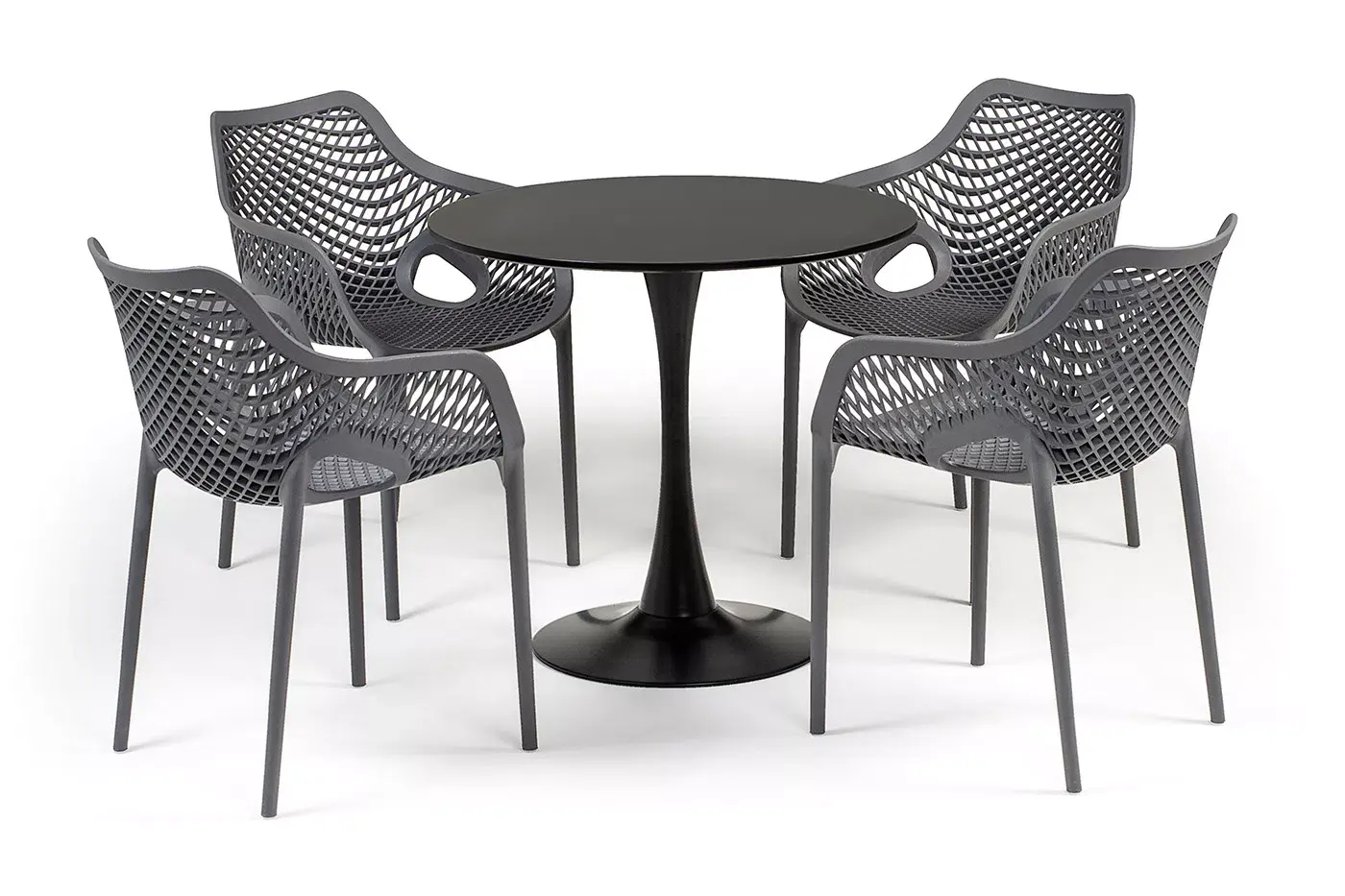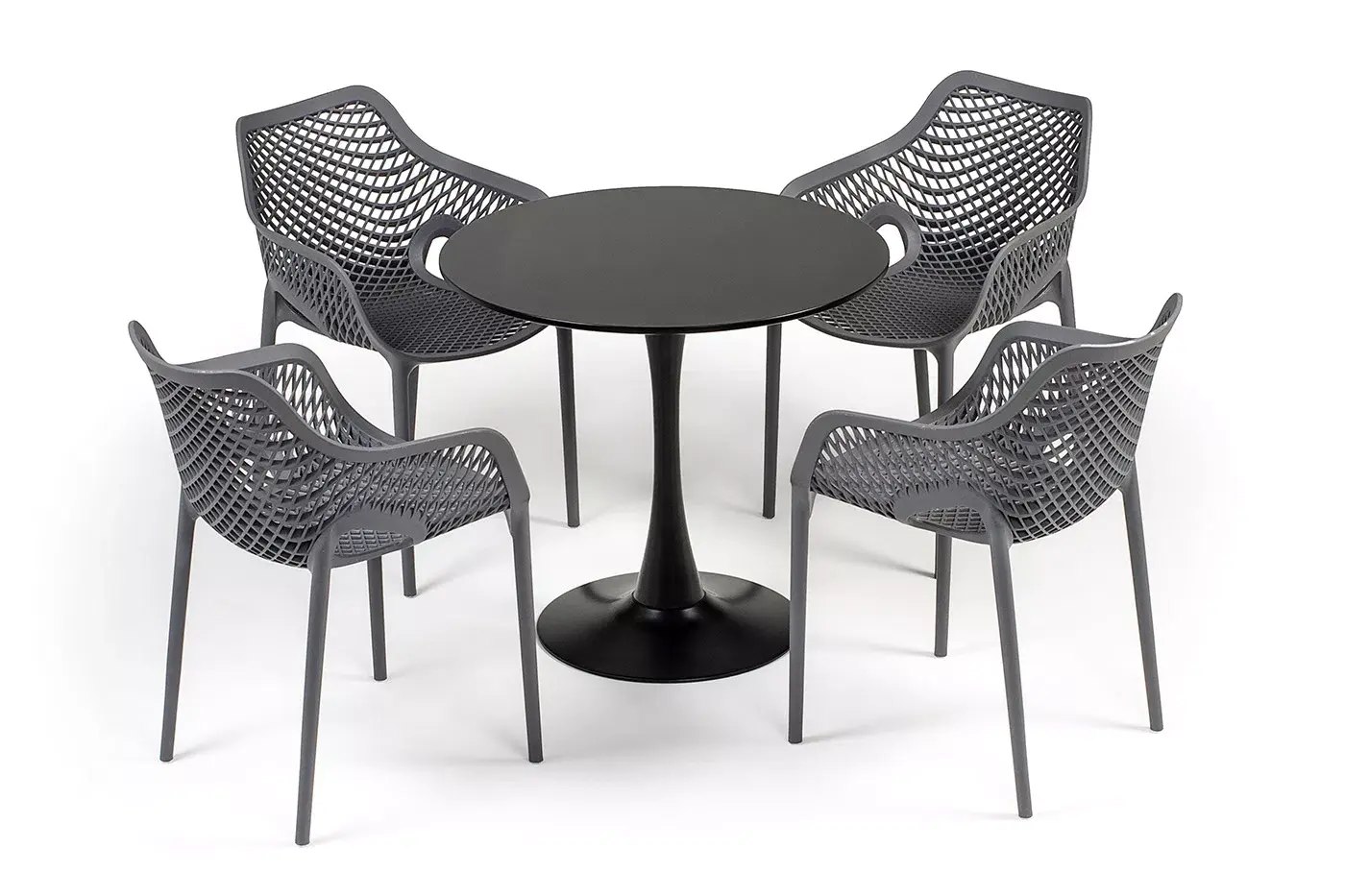 Стулья изготовлены из полипропилена, прочного и стойкого пластика, устойчивого к УФ-излучению, благодаря этому стул сохраняет свой первоначальный вид и не выцветает на солнце даже несмотря на активную эксплуатацию. Цвет - темно-серый.
