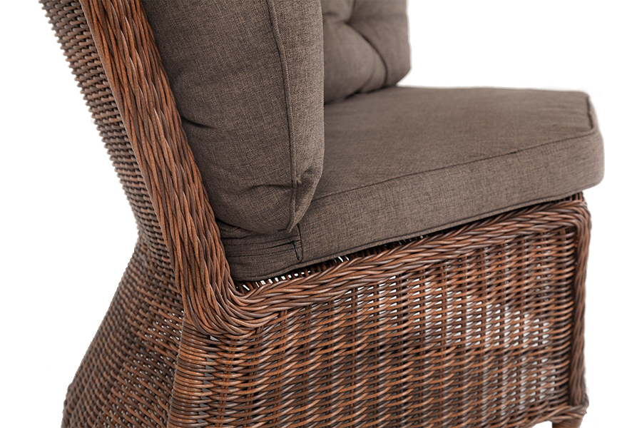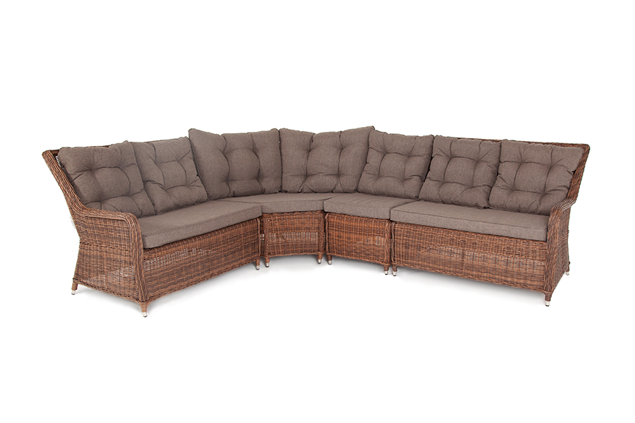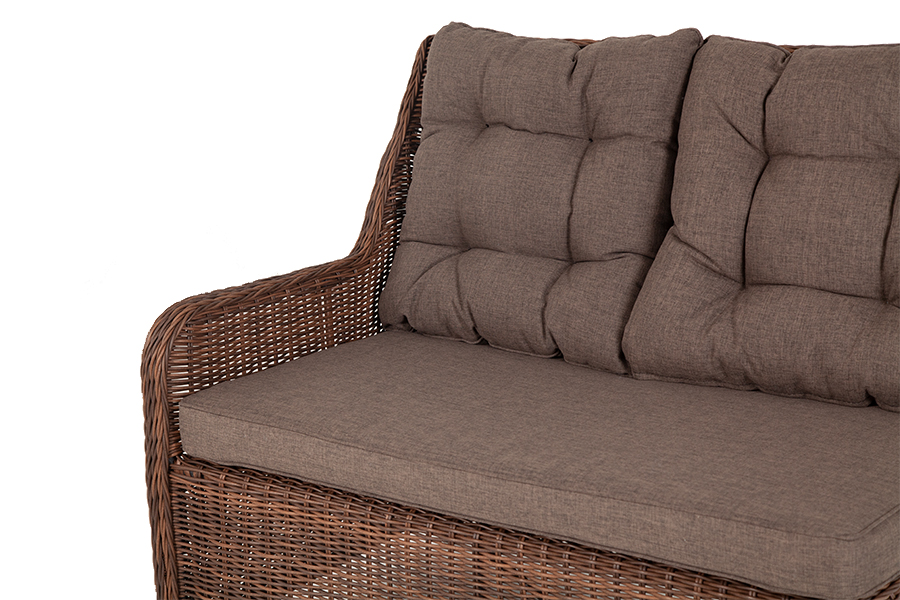 Модульный диван из искусственного ротанга «Бергамо» имеет угловую форму. Модель произведена посредством круглого плетения коричневого цвета и укомплектована мягкими подушками из полиэстера с влагоотталкивающей тканью. В основе дивана - прочный алюминиевый каркас.