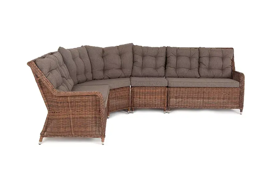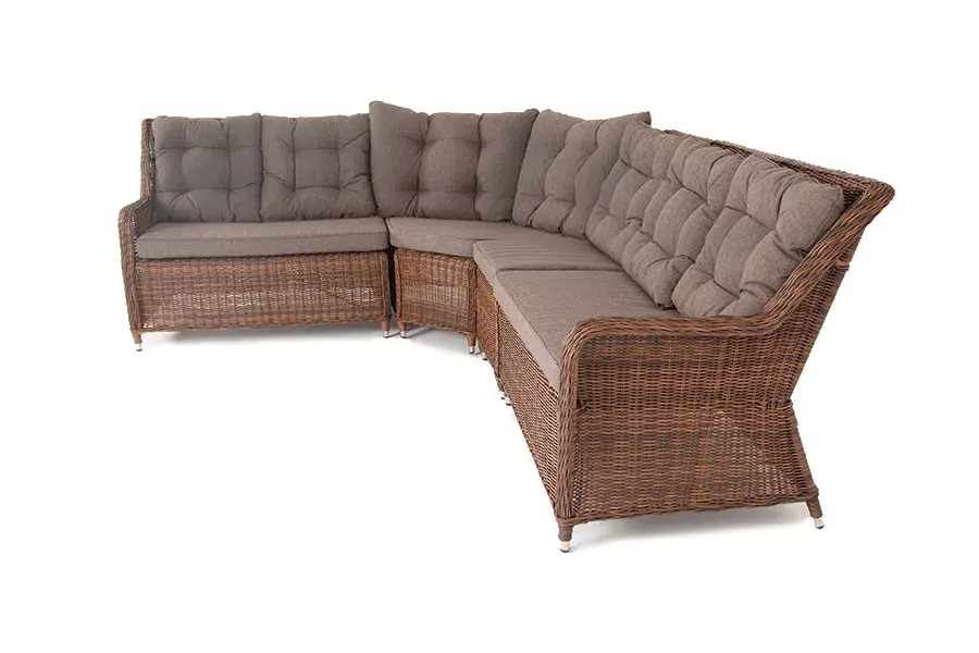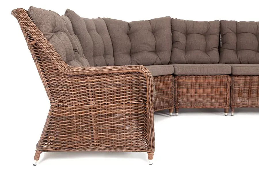 Модульный диван из искусственного ротанга «Бергамо» имеет угловую форму. Модель произведена посредством круглого плетения коричневого цвета и укомплектована мягкими подушками из полиэстера с влагоотталкивающей тканью. В основе дивана - прочный алюминиевый каркас.